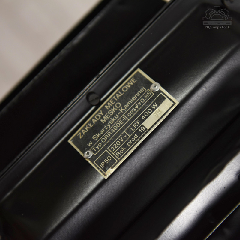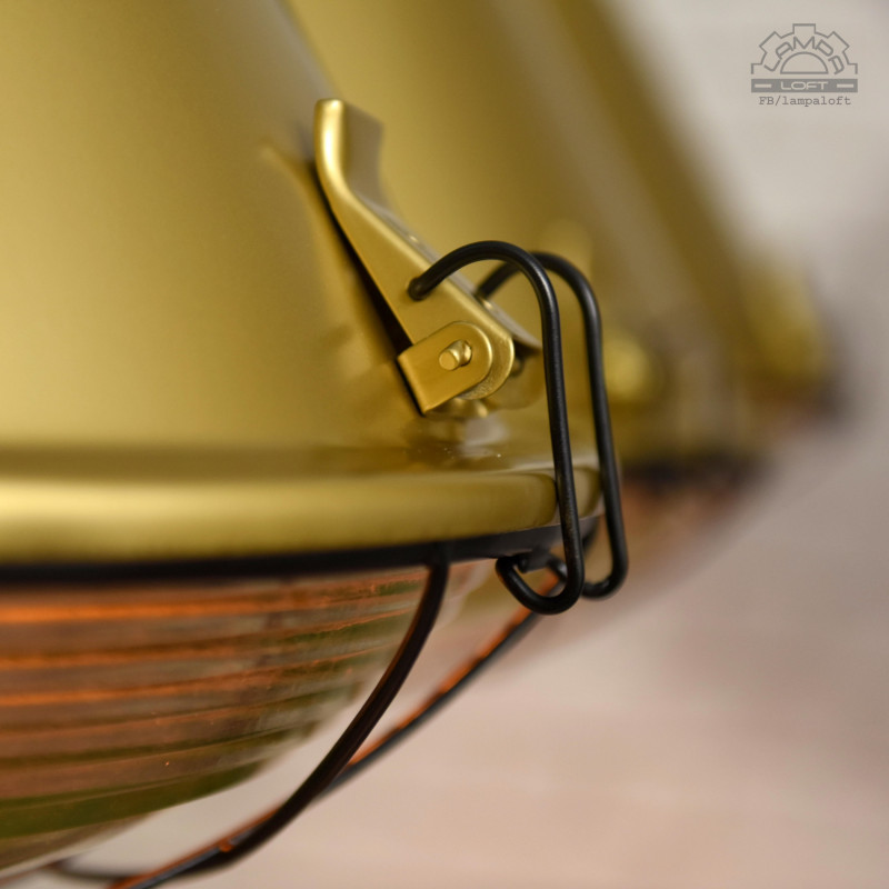 Industrial lamps ORP-400E-1 Zakłady Metalowe MESKO in Skarżysko-Kamienna. Produced in 1989. The lamps come from one of the industrial halls of the Szczecin Shipyard. Restored in gold and black. Metal holder for a standard E27 bulb, max. 100W. Prepared for hanging. Diameter 50cm, height 65cm, total length of the lamp with a 320cm cord, weight 10kg.