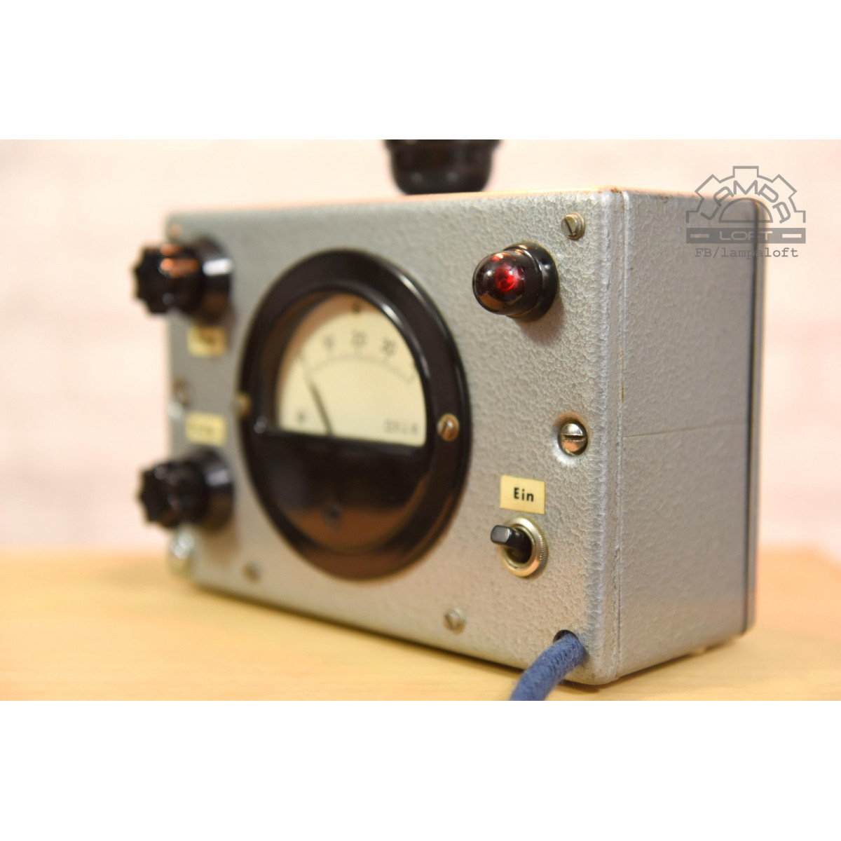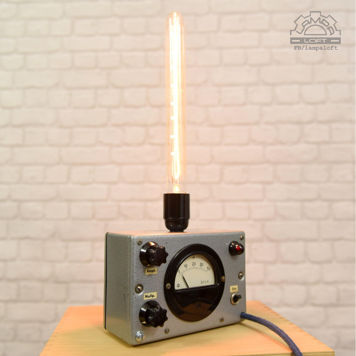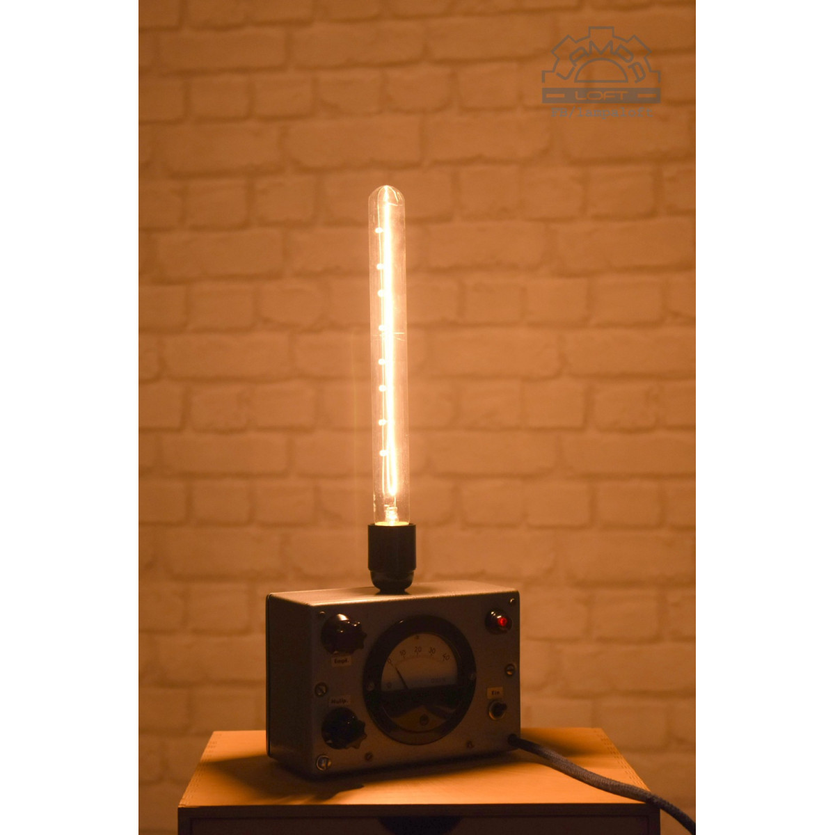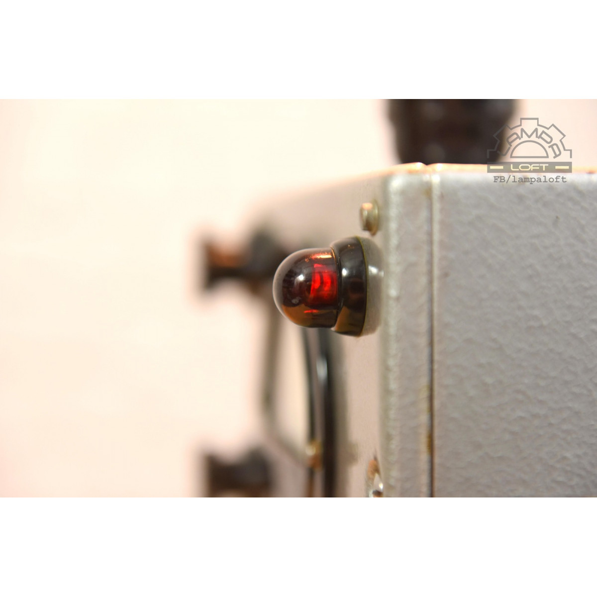 Lampka nocna ze starego urządzenia pomiarowego. Bakelitowe czarne elementy. Oprawka bakelitowa na zwykłą żarówkę E27 max. 75W. Przewód w oplocie bawełnianym. Żarówka nie jest w zestawie.