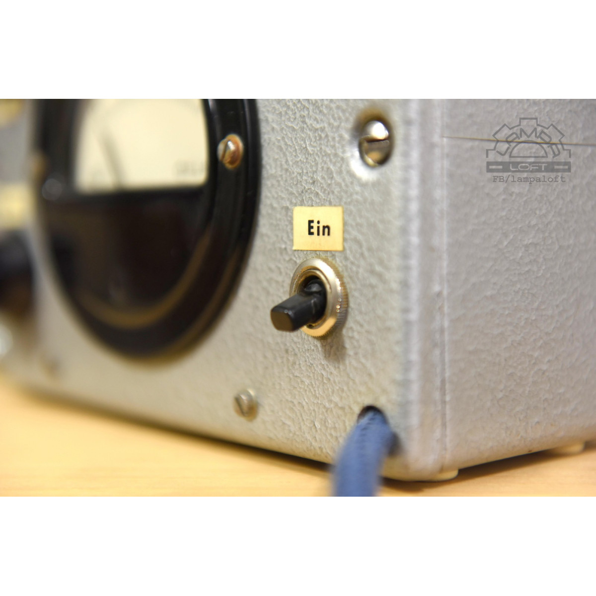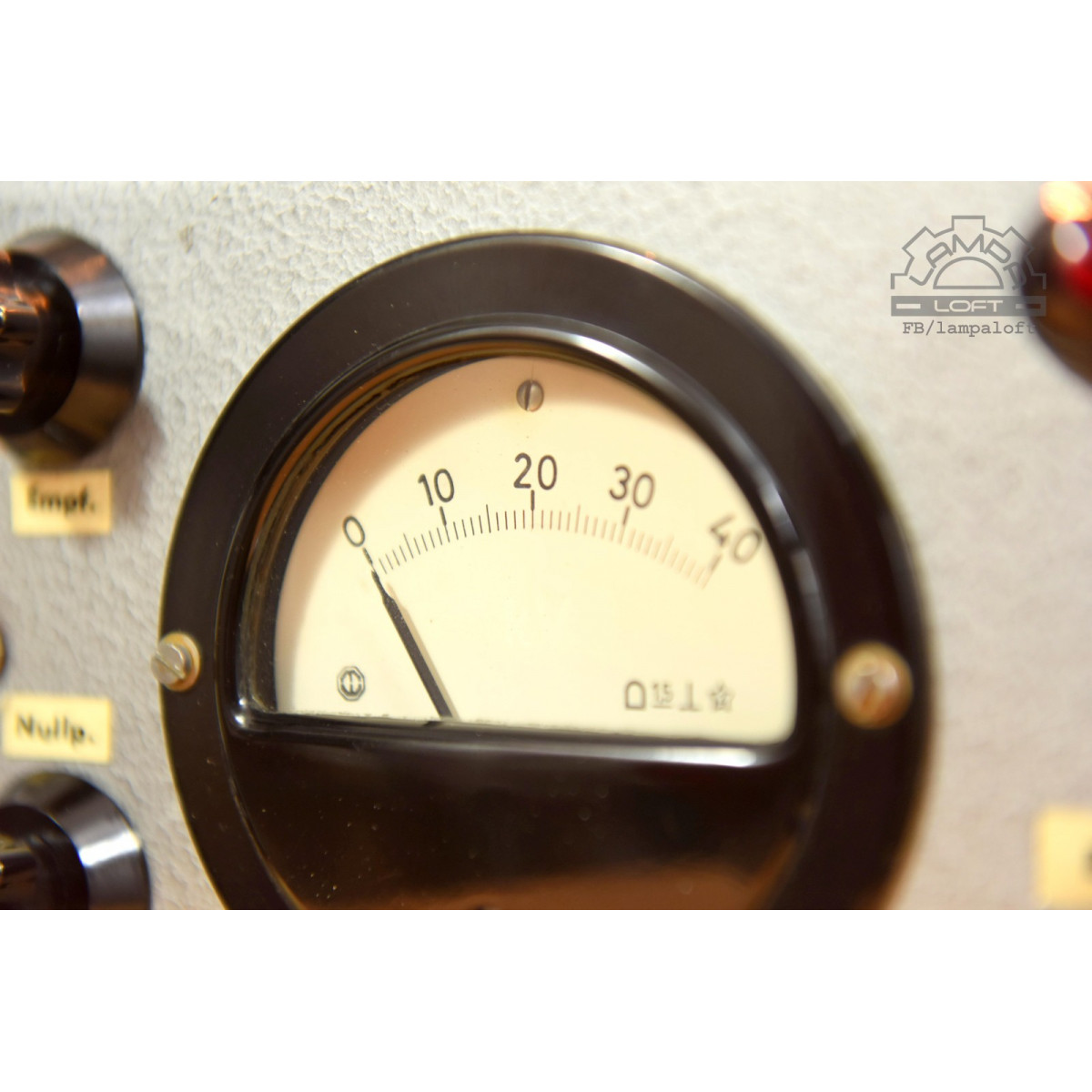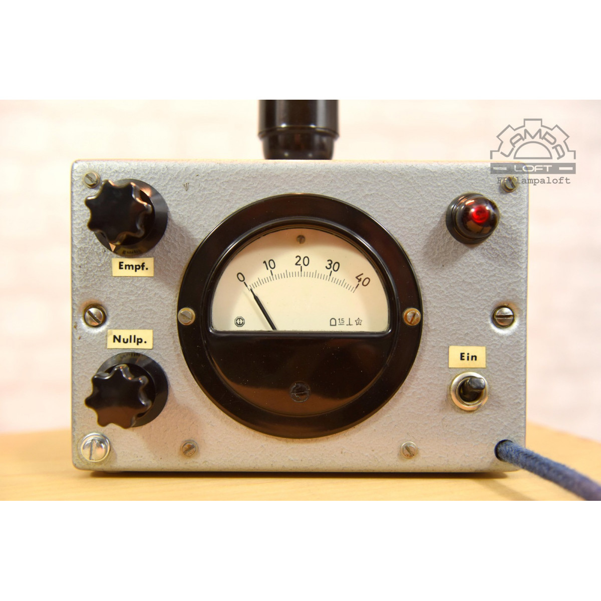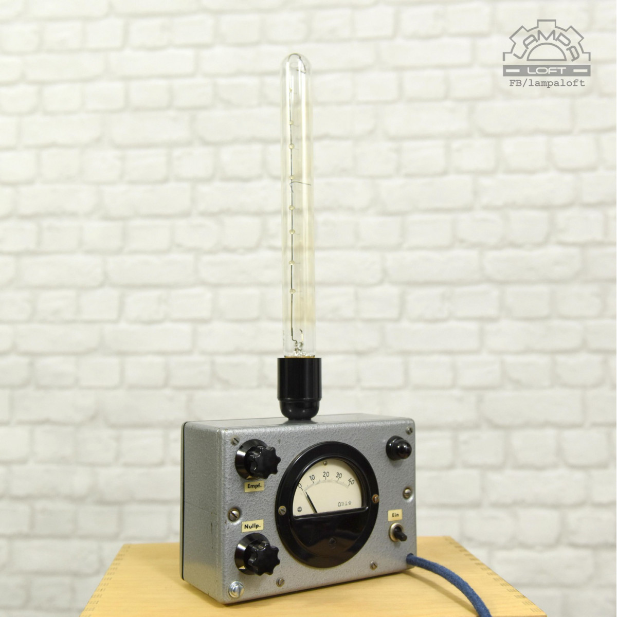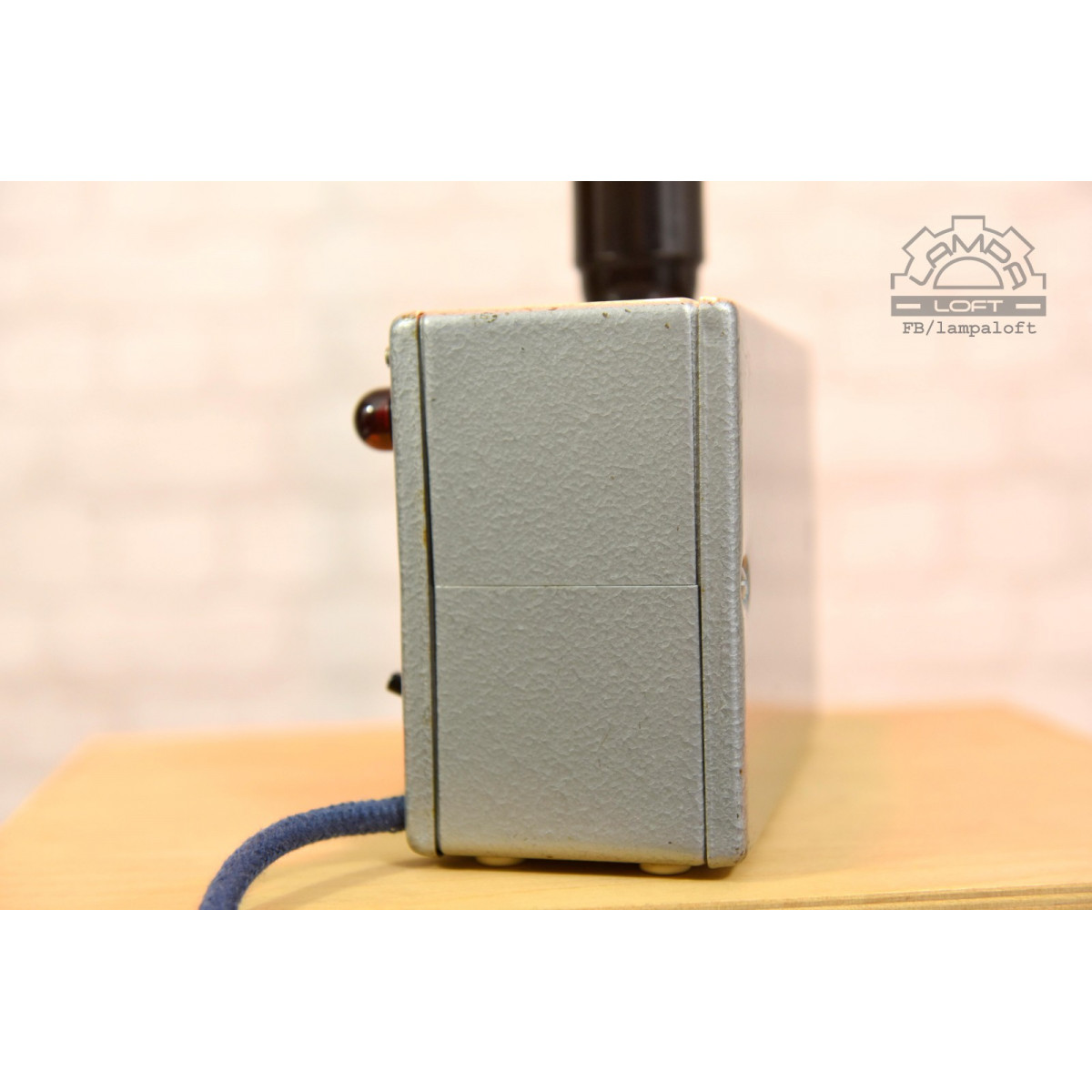 Lampka nocna ze starego urządzenia pomiarowego. Bakelitowe czarne elementy. Oprawka bakelitowa na zwykłą żarówkę E27 max. 75W. Przewód w oplocie bawełnianym. Żarówka nie jest w zestawie.