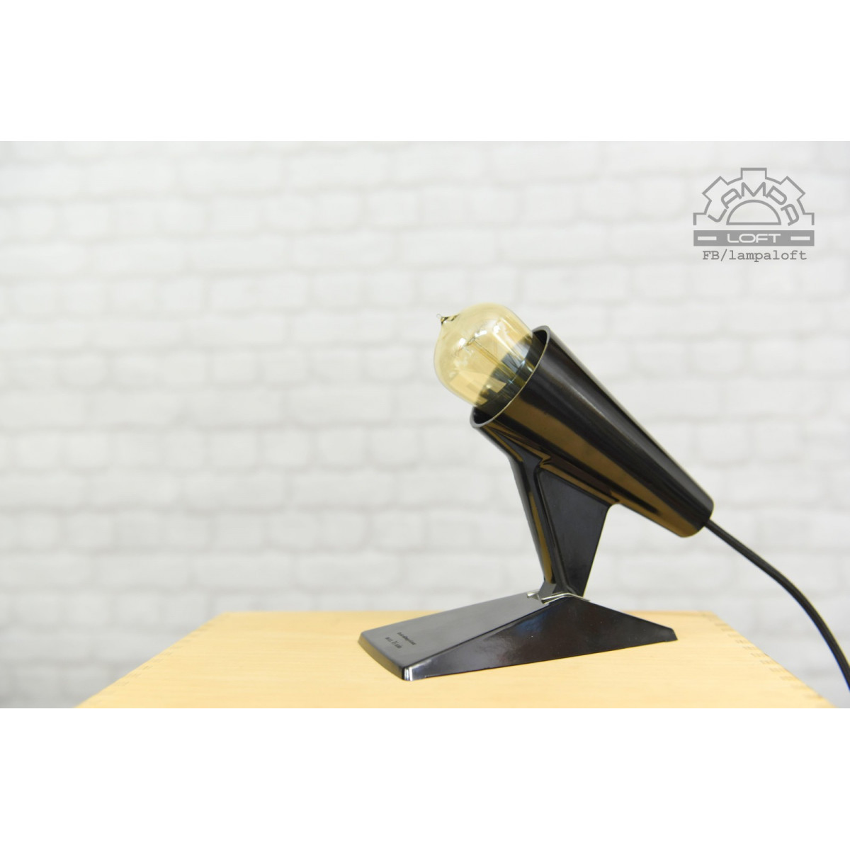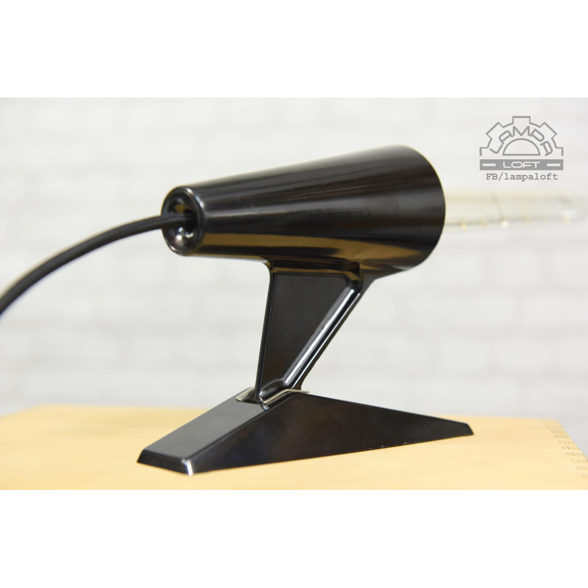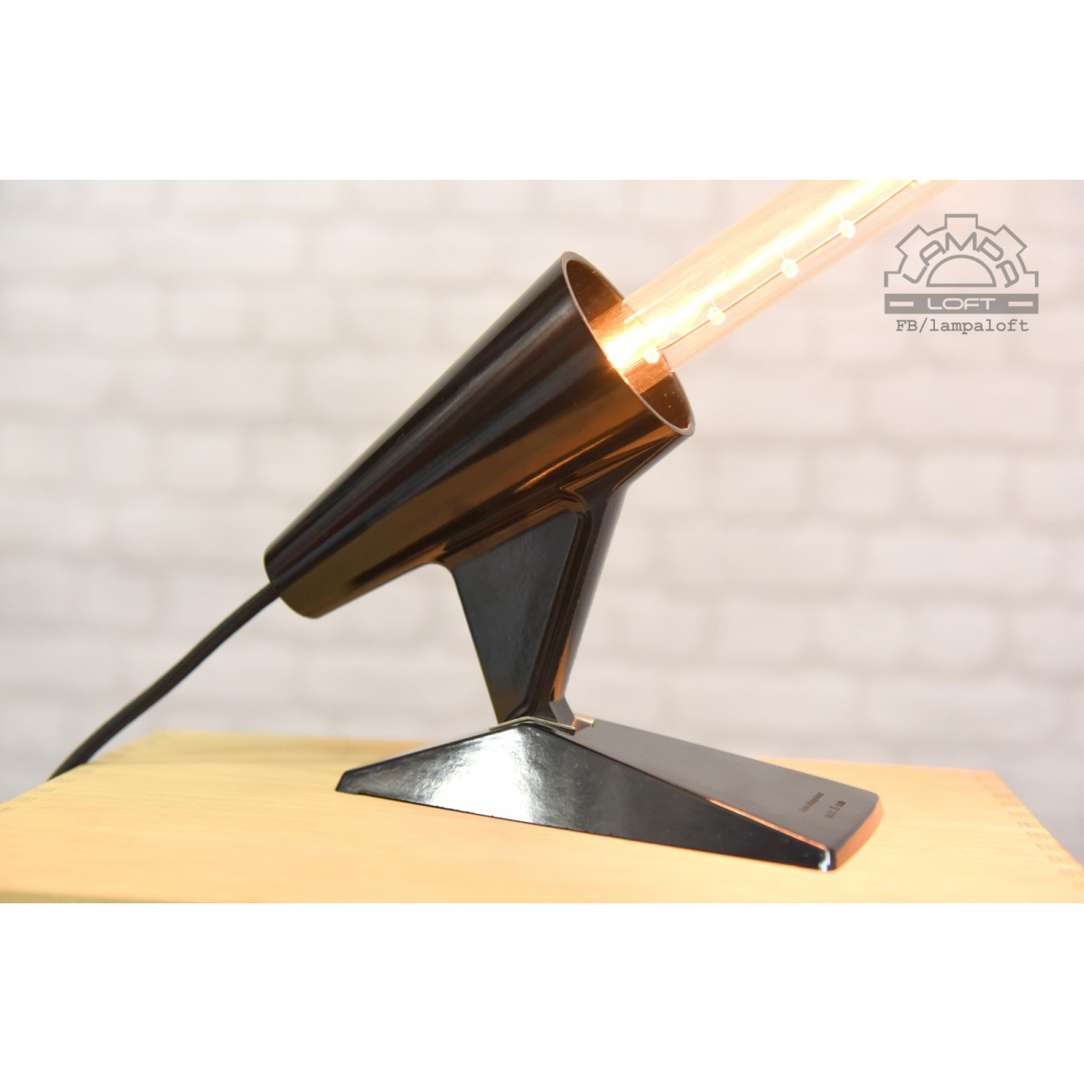 Nietypowa lampka bakelitowa z przewodem w oplocie. Wielkość bez żarówki ok. długość 20cm, wysokość 20cm, szerokość 10cm. Do lampki pasują żarówki E27 długie takie jak na zdjęciu lub podobne. Oprawka jest głęboko osadzona. Przewód w oplocie 200cm.