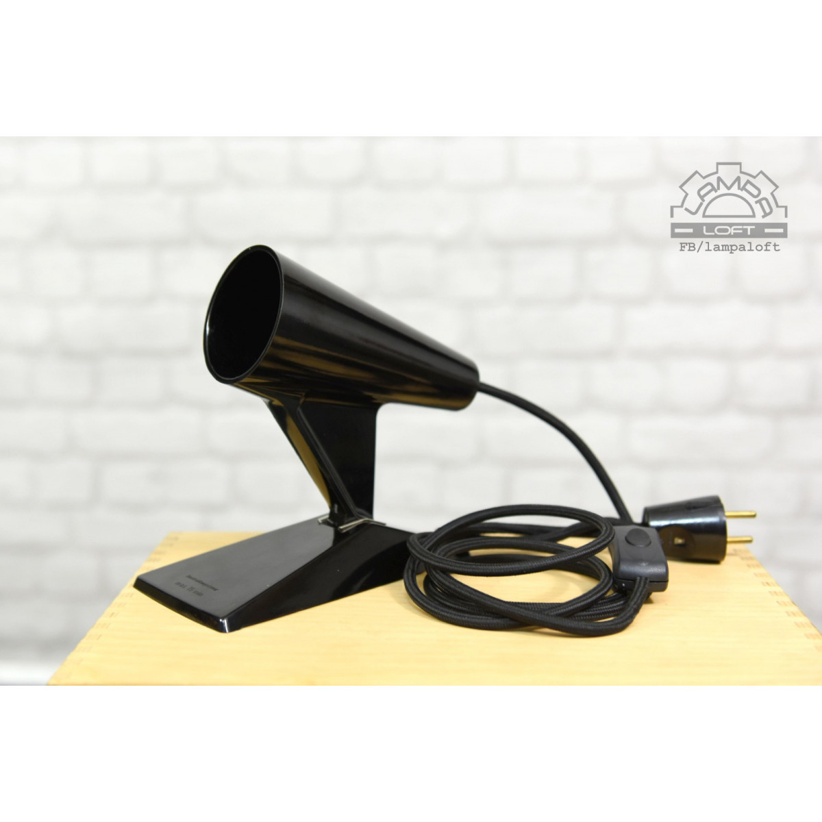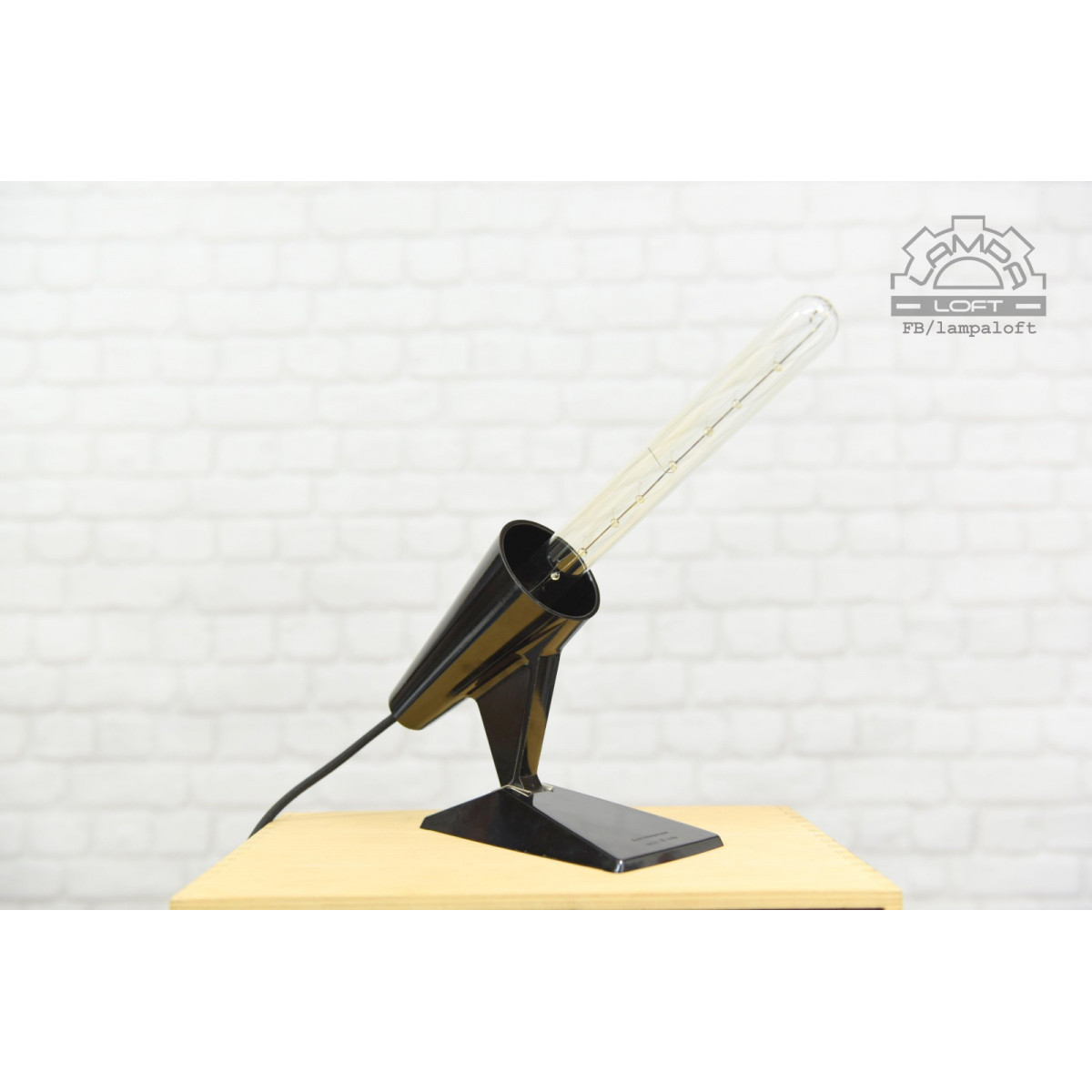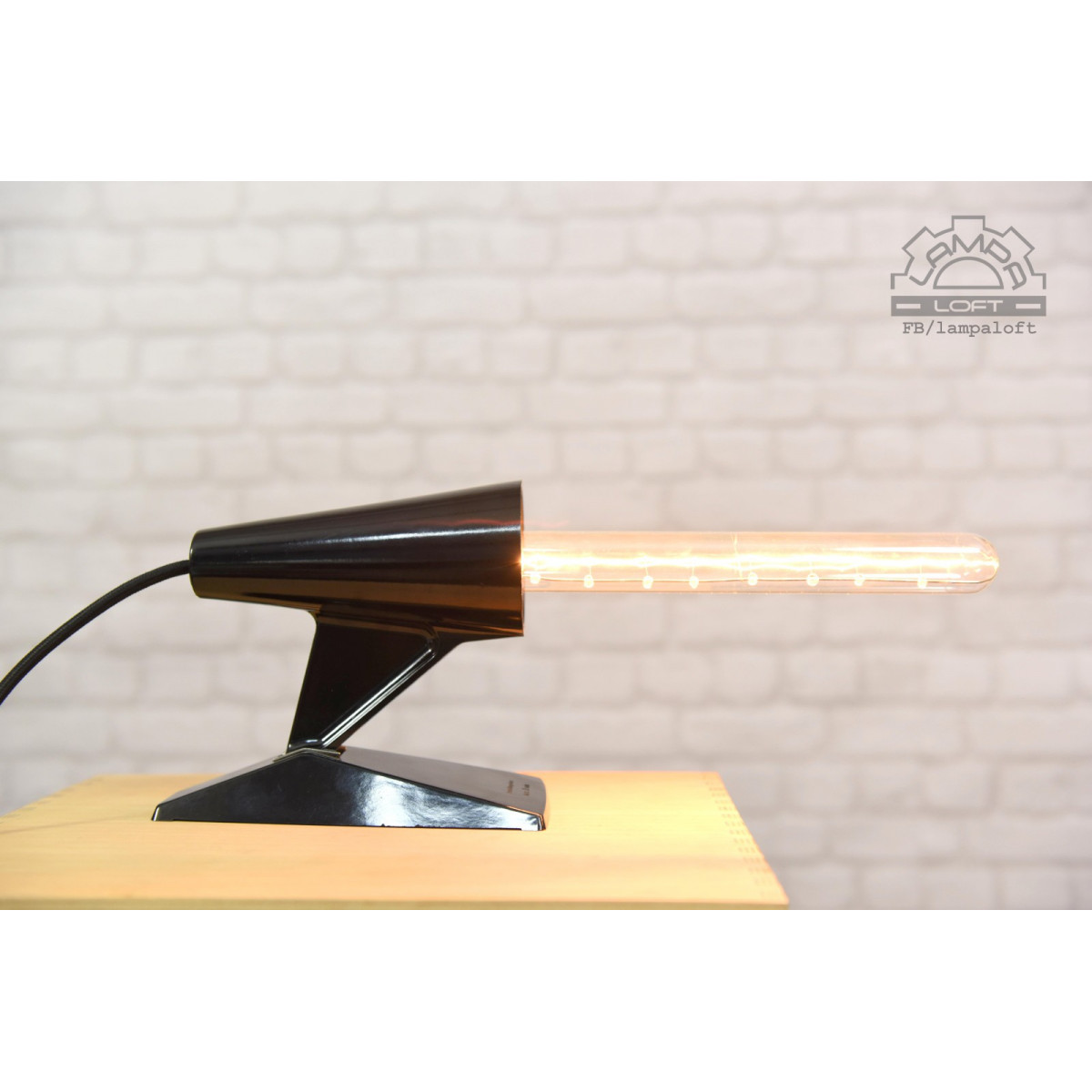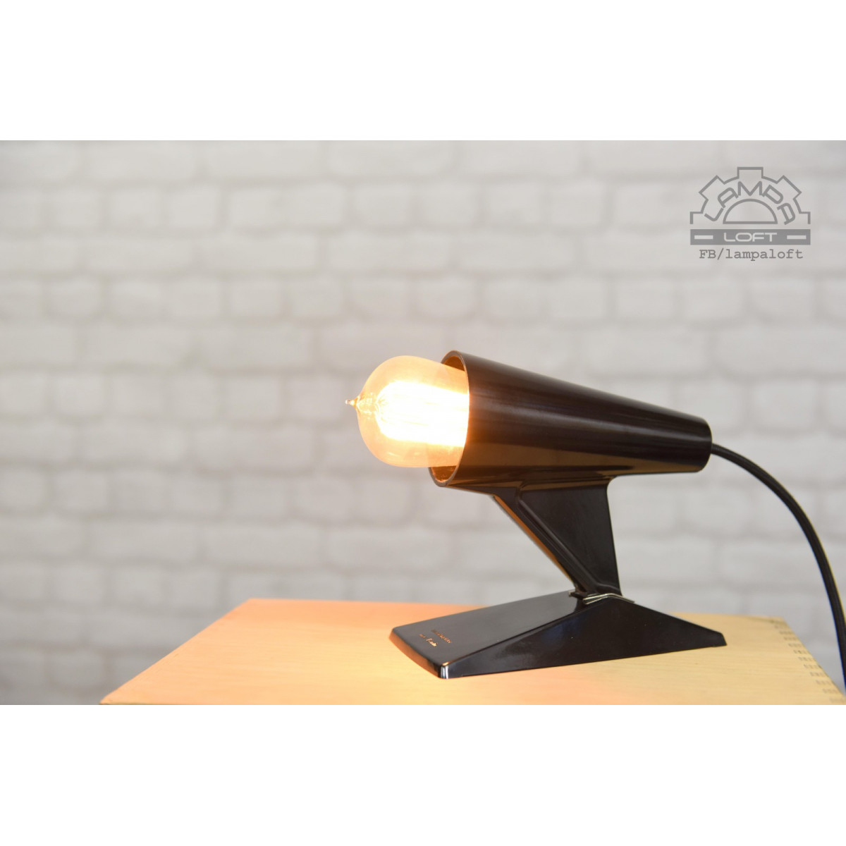 Nietypowa lampka bakelitowa z przewodem w oplocie. Wielkość bez żarówki ok. długość 20cm, wysokość 20cm, szerokość 10cm. Do lampki pasują żarówki E27 długie takie jak na zdjęciu lub podobne. Oprawka jest głęboko osadzona. Przewód w oplocie 200cm.