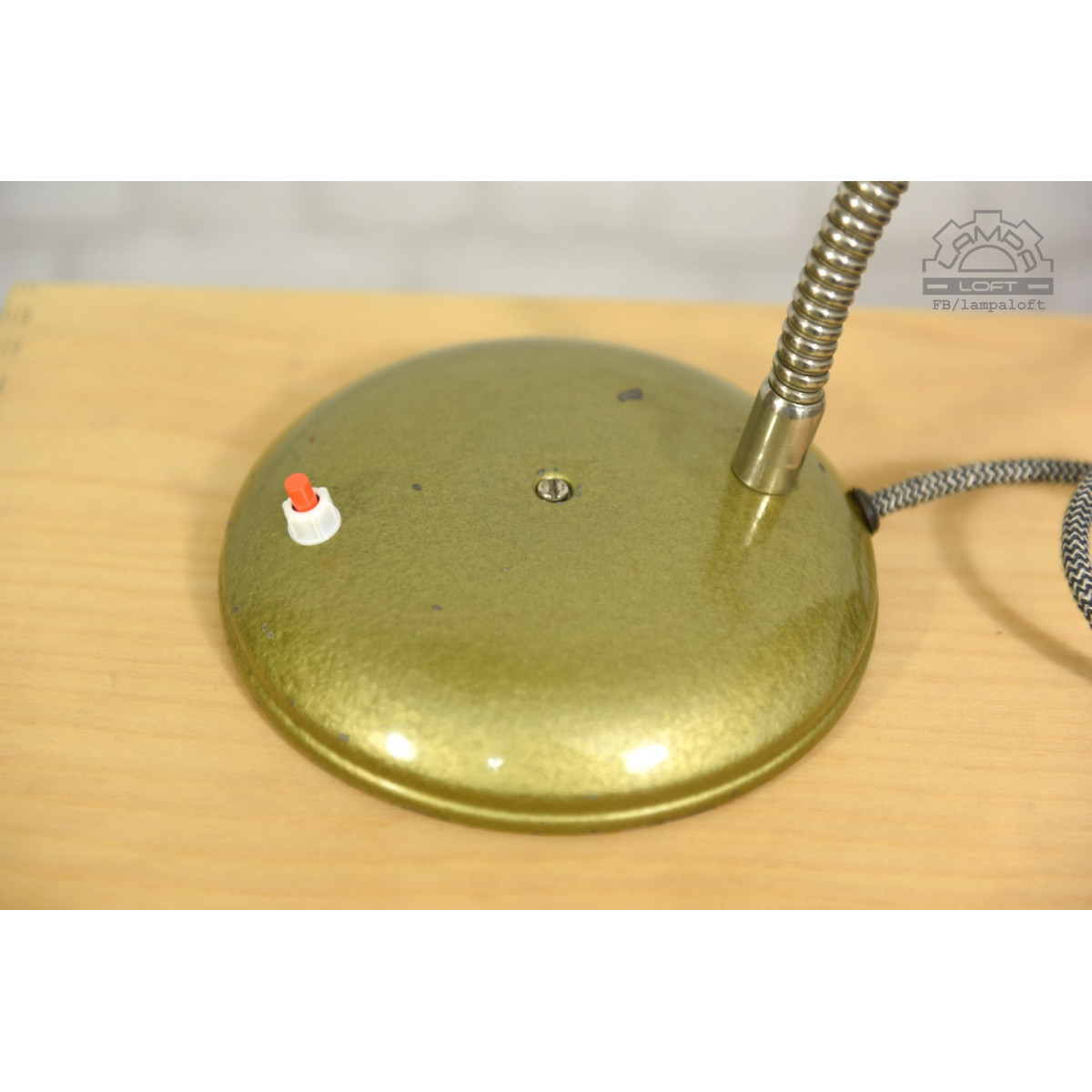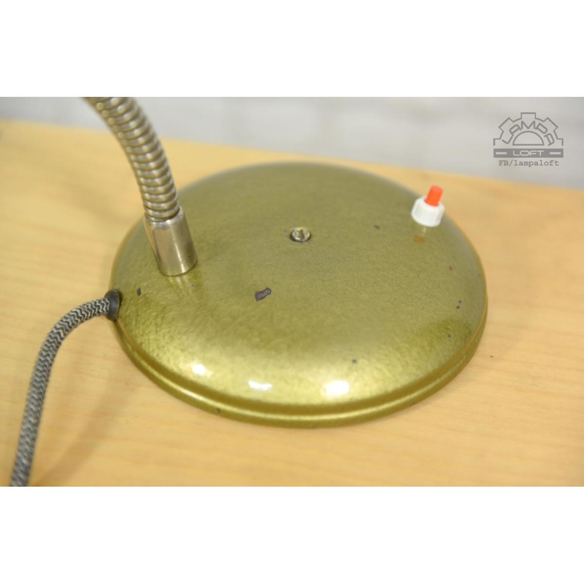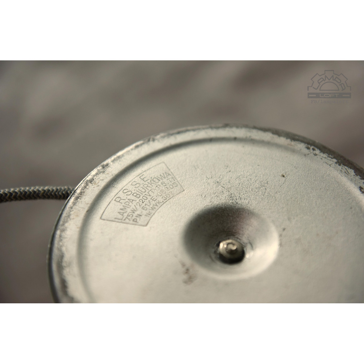 Lampa przywrócona do życia. Wyprodukowana w latach 70' przez R.S.S.E. Rzemieślnicza Spółdzielnia Specjalistyczna Elektryków w Warszawie. Zachowane powłoki lakiernicze w oryginalnym stanie. Nowa instalacja elektryczna. Przewód w oplocie bawełniano-lnianym 140cm. Podstawa średnicy 16cm, klosz 13cm, wysokość 50cm. Oprawka E27 na zwykłą żarówkę max.75W.