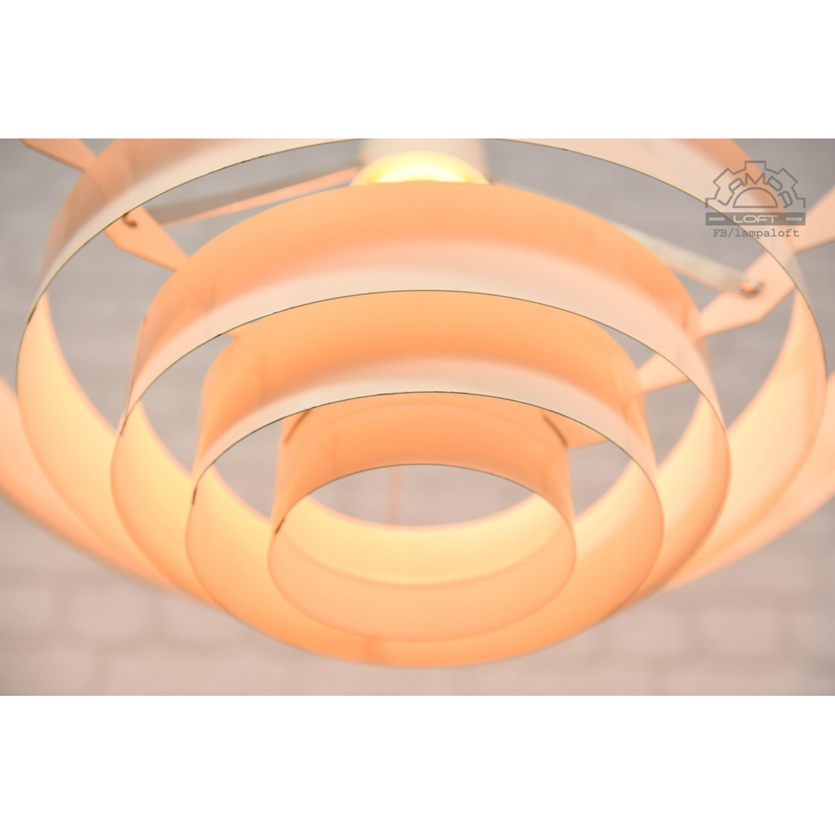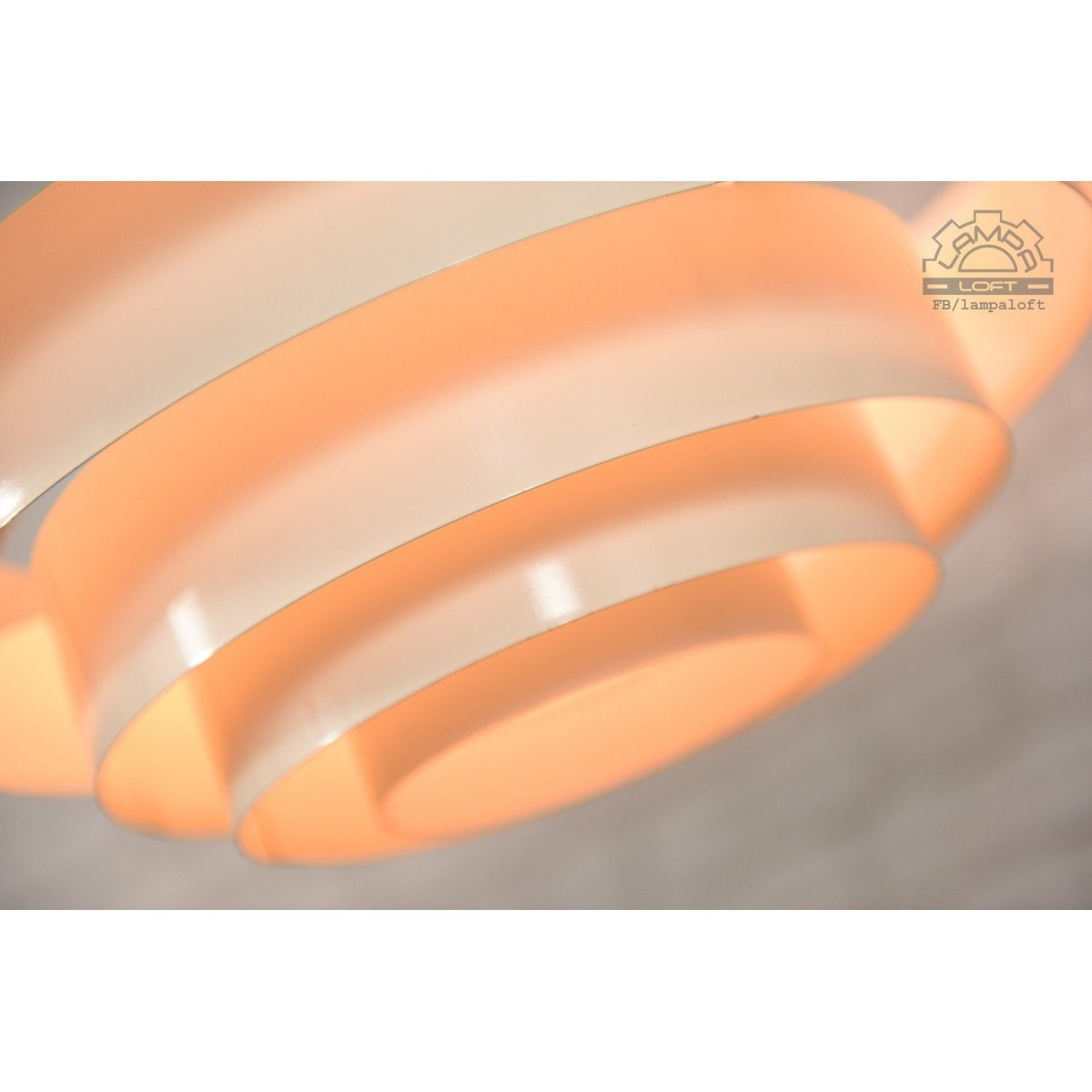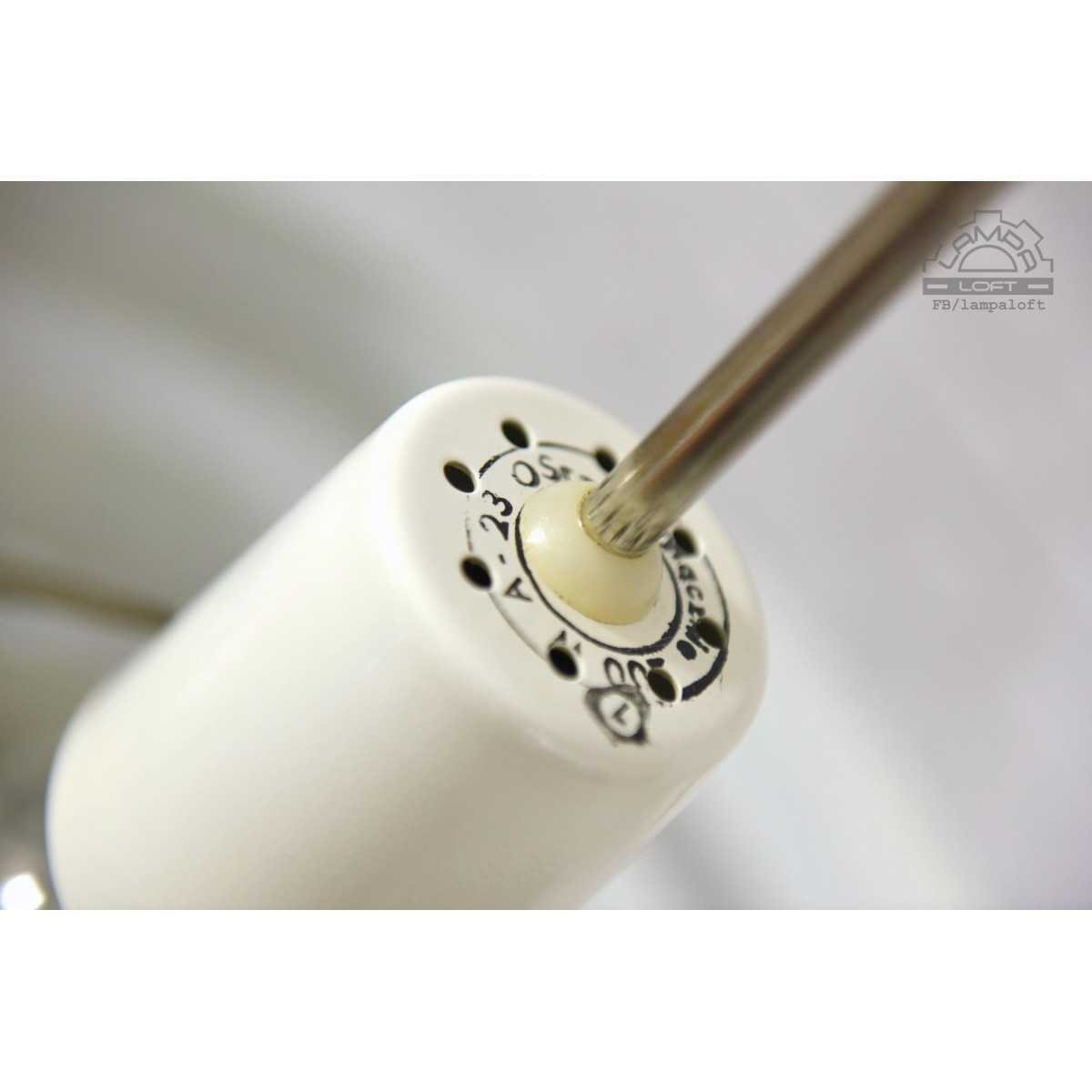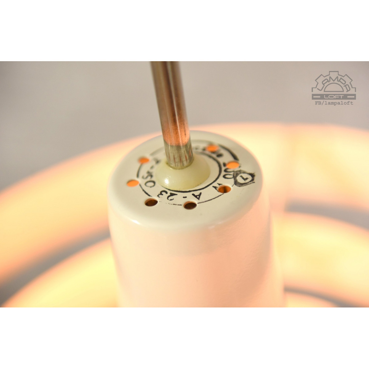 Raster lampy wykonany ze stali. Rzadko spotykany model. Późniejsze modele OR-2 z lat 70 były plastikowe. Średnica 47cm !!!, wysokość 63cm. Zachowana oryginalna powłoka lakiernicza. Oprawka porcelanowa na zwykłą żarówkę E27 max. 200W.