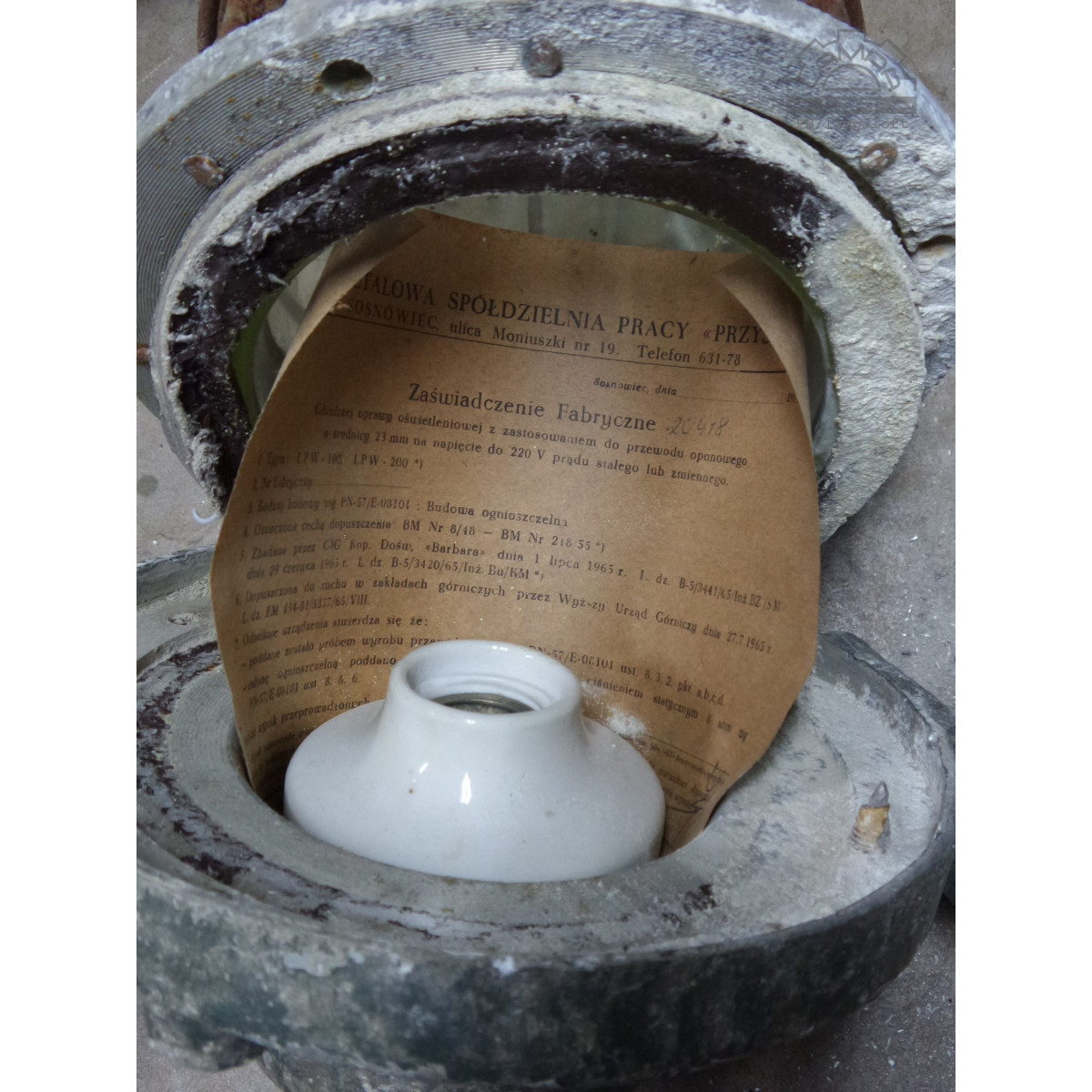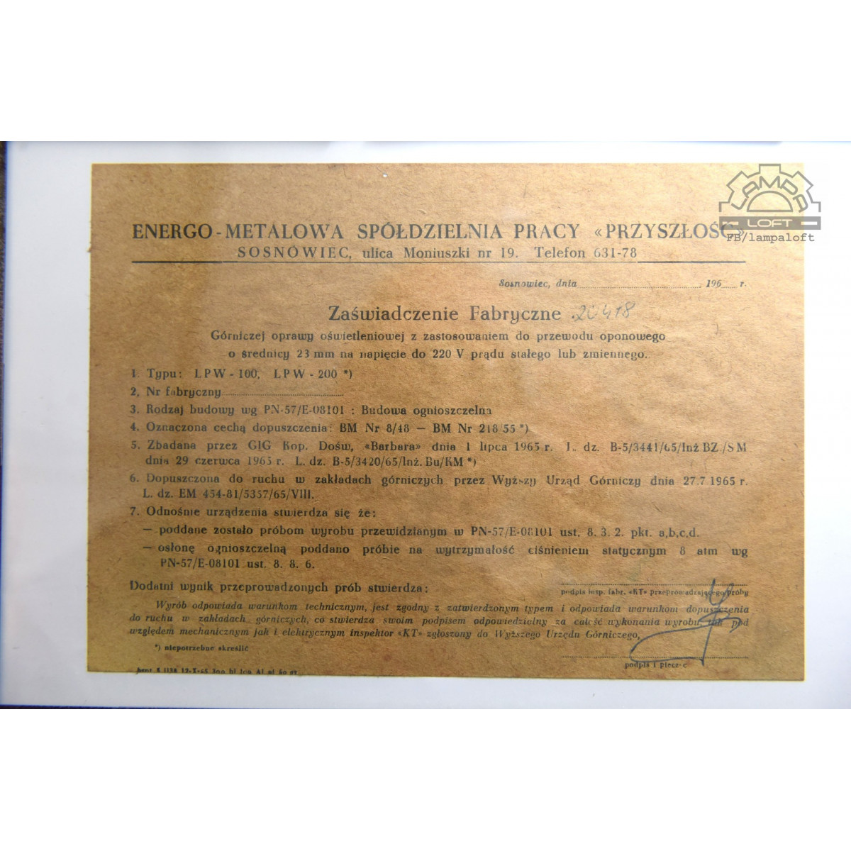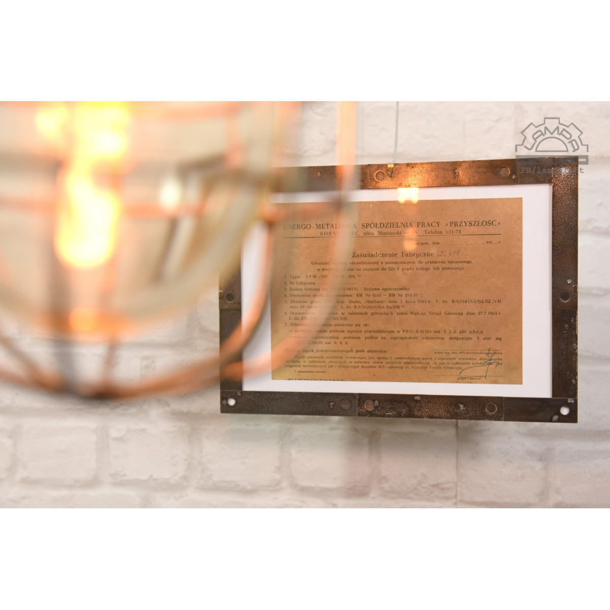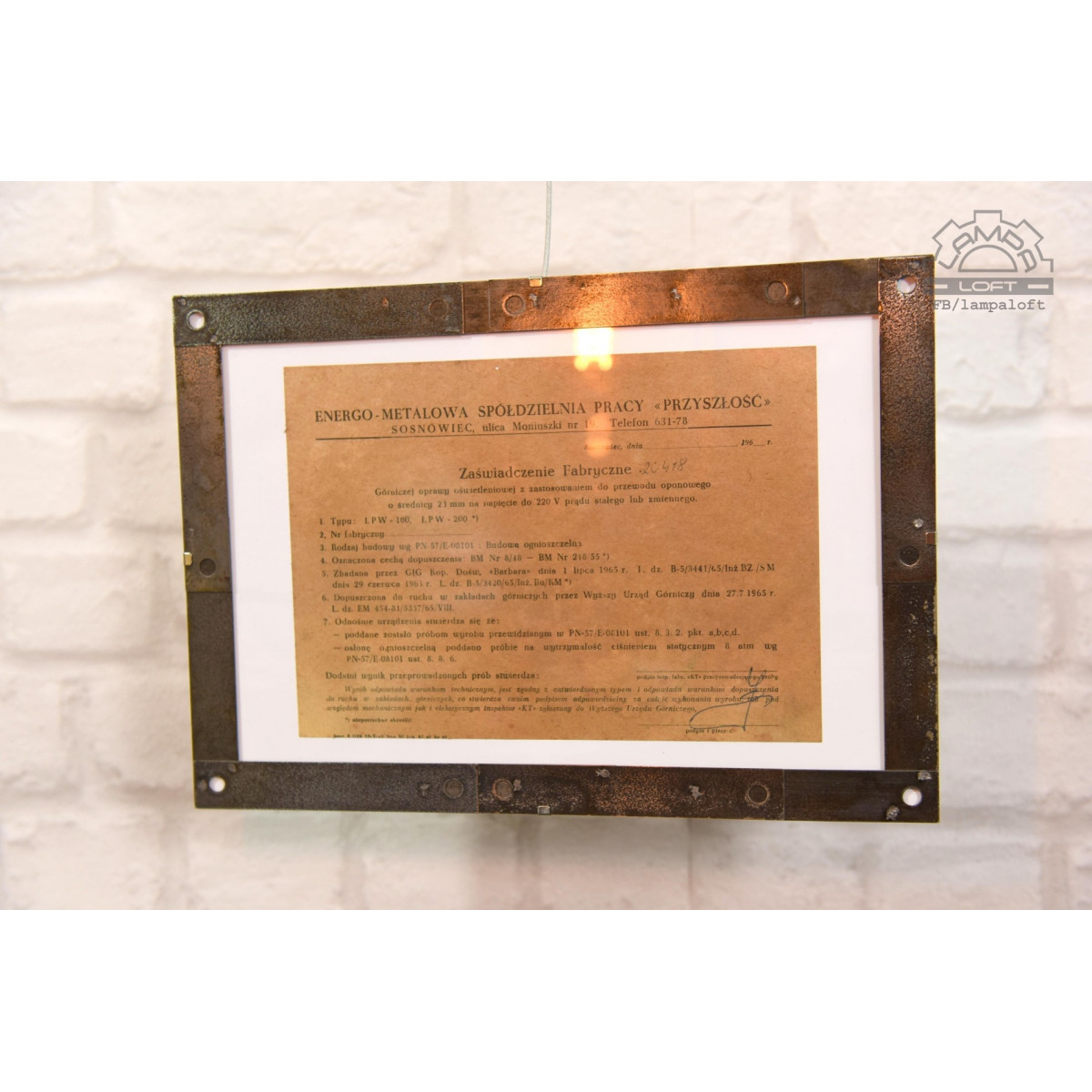 Lampa była "nowa" nigdy nie zamontowana. W środku lampy znajdowało się zaświadczenie fabryczne nr 20418. Zaświadczenie jest teraz oprawione w ramkę stalową wykonaną z pasków stalowych transformatora czechosłowackiej lampy Elektrosvit.