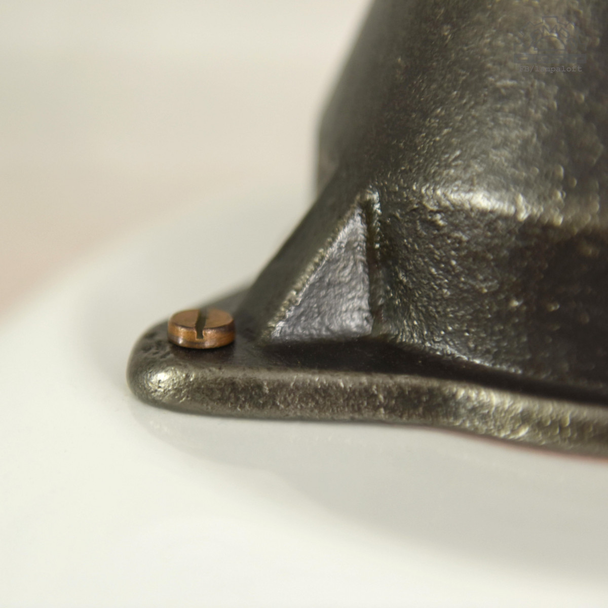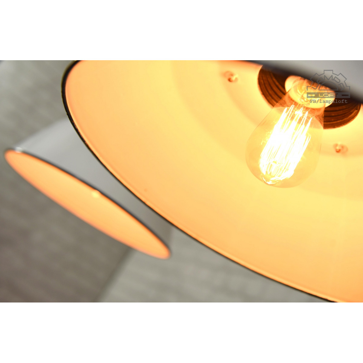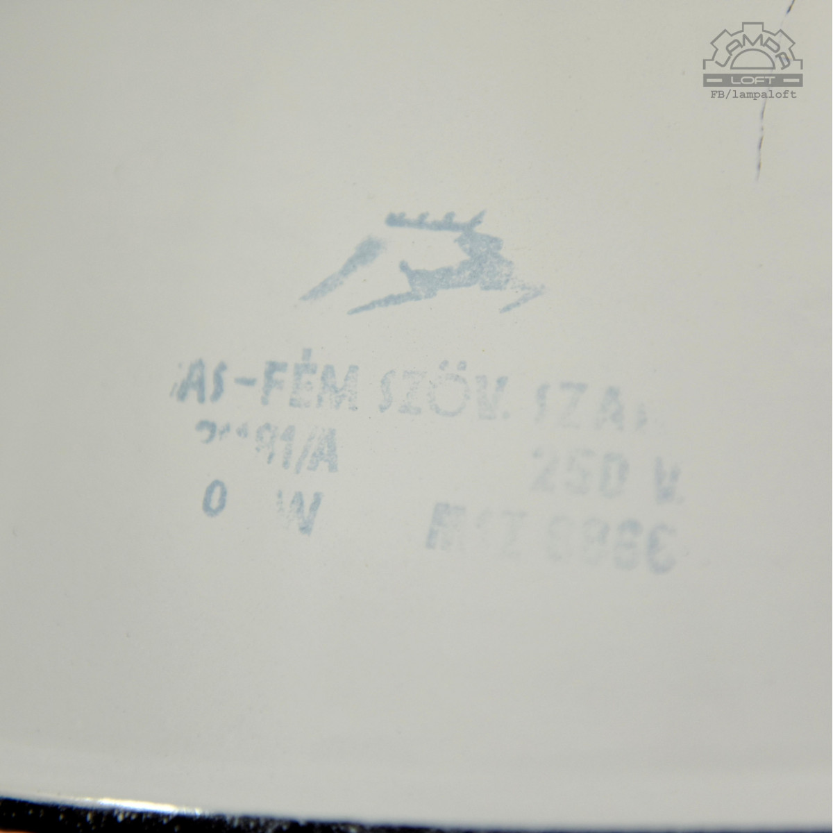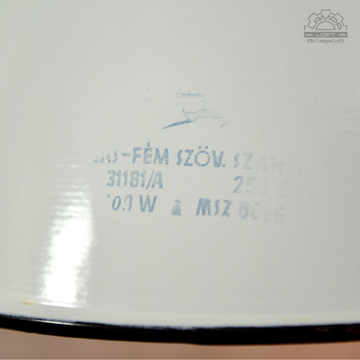 Węgierskie lampy industrialne wyprodukowane w latach 50' przez VAS-FEM SZOV. SZAVA. Bardzo rzadki model na naszym rynku. Emalia ceramiczna zachowana w idealnym stanie. Średnica 36cm, wysokość 26cm, długość całej wiszącej lampy z przewodem o oplocie bawełnianym 220cm, waga 2,6kg. Oprawka ceramiczna na zwykłą żarówkę E27 max. 100W. Przygotowane do zawieszenia. Kostka do podłączenia w maskownicy.