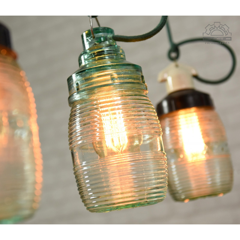 Radzieckie lampy industrialne "słoiki". Zielone grube szkło. Oprawka E27 max. 60W Średnica 12cm, wysokość 24cm, długość całej wiszącej lampy z przewodem w oplocie bawełnianym 115cm. Przygotowana do zawieszenia. Kostka do podłączenia w czarnej osłonie sufitowej.