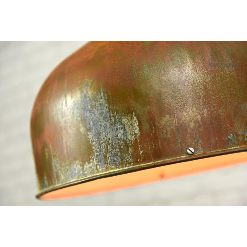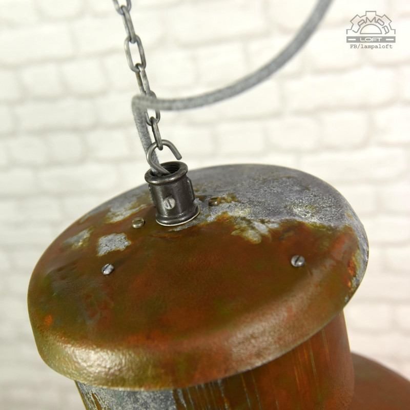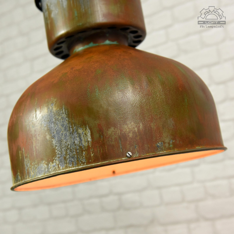 Bardzo rzadka industrialna lampa ORZ-1 z lat 60'. Wyprodukowana przez Zakłady Metalowe MESKO w Skarżysku- Kamiennej. UWAGA ! Rdza jest zrobiona przeze mnie. Jest zabezpieczona i nie brudzi. Średnica 43cm, wysokość 49cm, długość całej wiszącej lampy z przewodem w oplocie bawełnianym 230cm. Oprawka porcelanowa na zwykłą żarówkę E27 max. 150W.