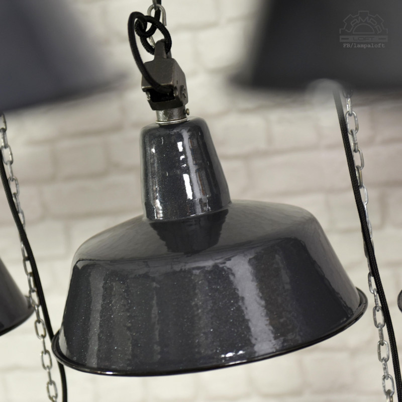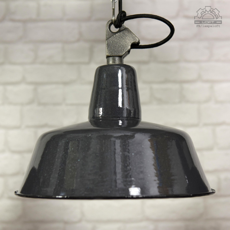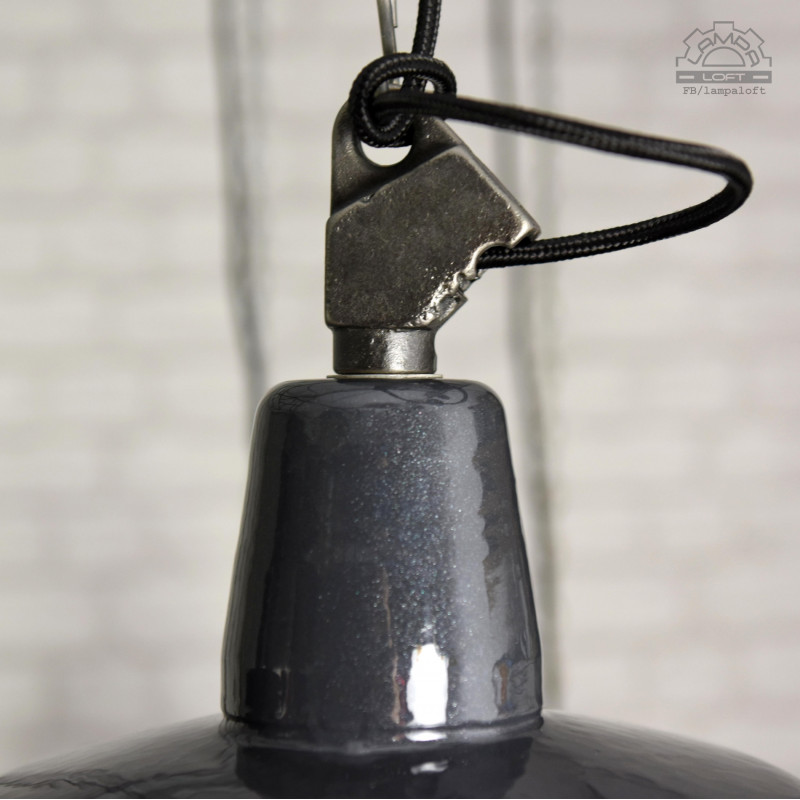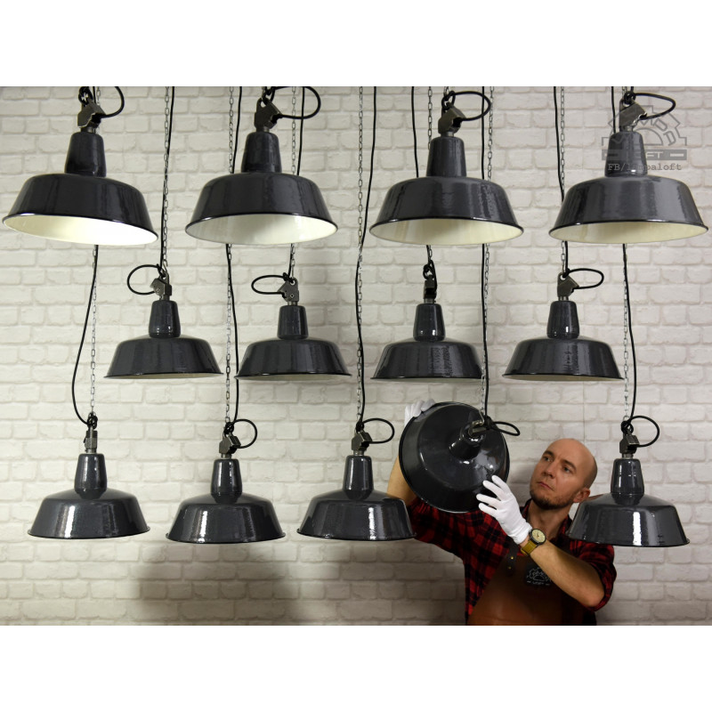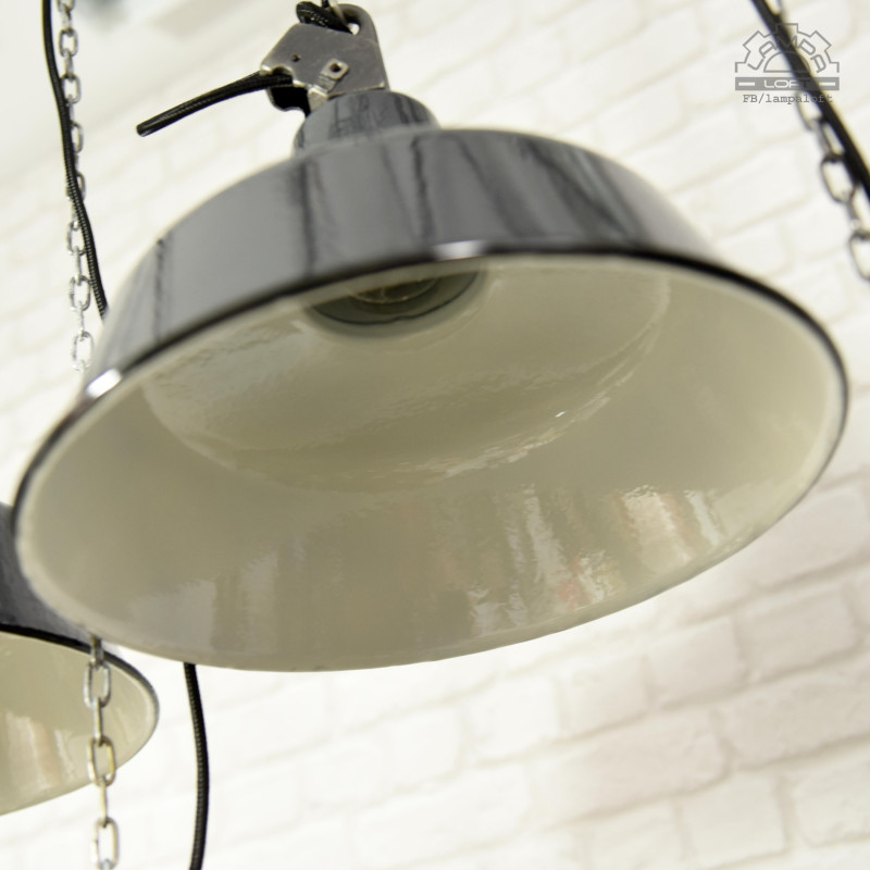 Odrestaurowane lampy industrialne OBs-2 z lat 60' wyprodukowane przez Mazurskie Zakłady Aparatury Oświetleniowej A-23 w Wilkasach. Średnica 32cm, wysokość 28cm, długość całej wiszącej lampy z przewodem w oplocie 200cm. Oprawka metalowa na zwykłą żarówkę E27 max.100W. Przygotowane do zawieszenia. Kostka do podłączenia w czarnej plastikowej osłonie sufitowej.