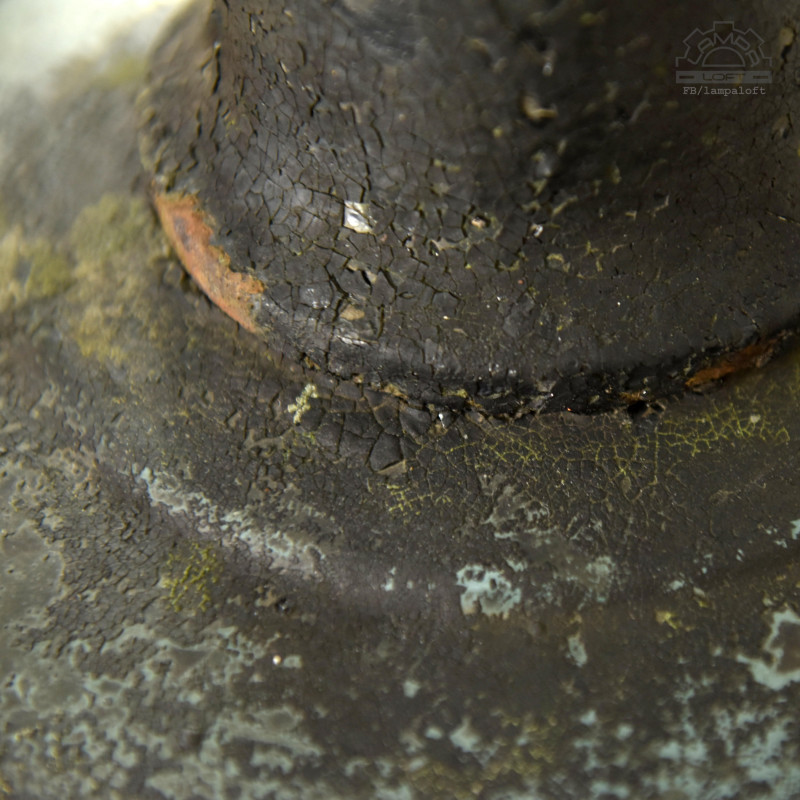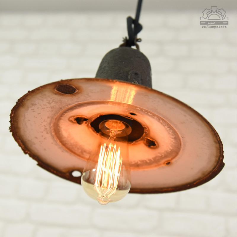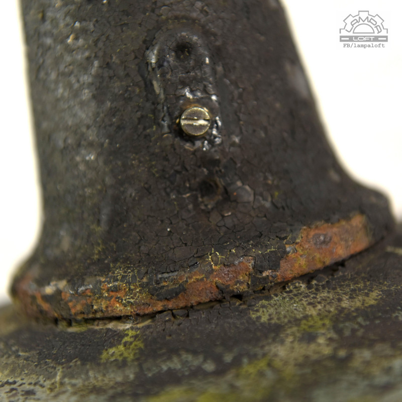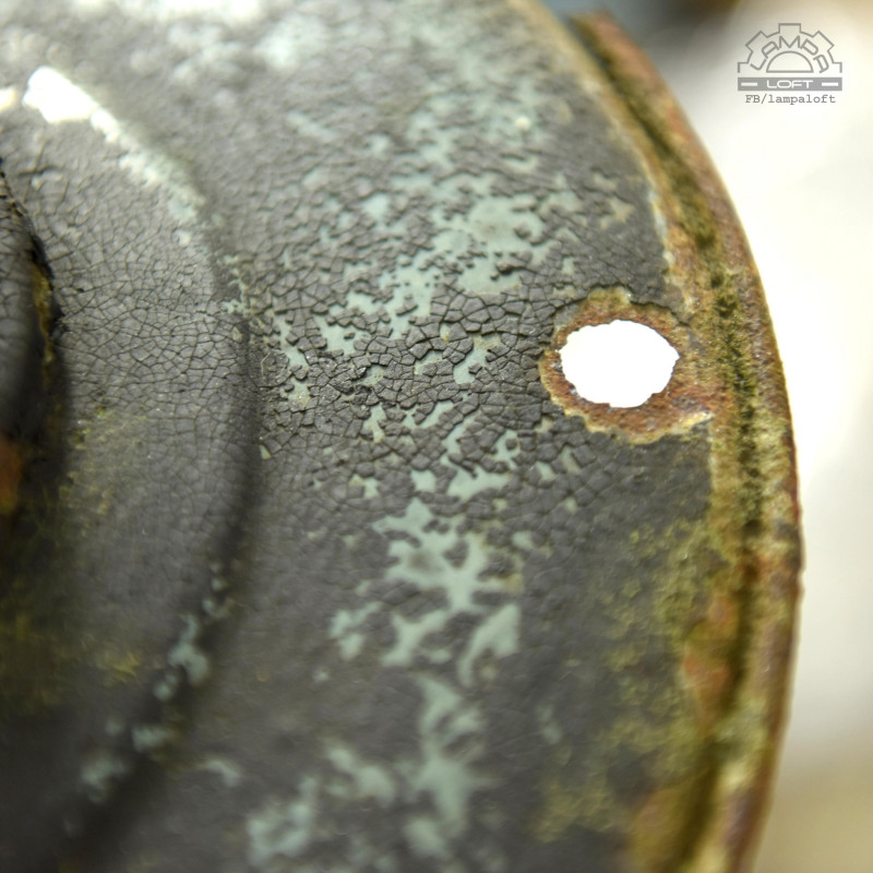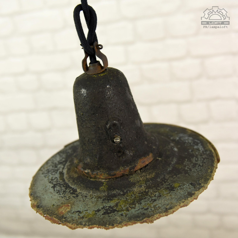 Piękno ukryte w niedoskonałości czyli wabi-sabi. Lampa nadgryziona zębem czasu. Wisiała prawie 70 lat na zewnątrz oświetlając jedną z ulic w Wielkopolsce.Unikatowy model lampy z lat 50' OŻk-1 wyprodukowana przez Mazurskie Zakłady Aparatury Oświetleniowej A-23 w Wilkasach. Żeliwny korpus, stalowy klosz, stalowa oprawka na zwykłą żarówkę E27 max. 100W. Regulacja głębokości oprawki w korpusie.Średnica 29cm, Wysokość 22cm, długość całej wiszącej lampy 150cm. Przygotowana do zawieszenia. Kostka do podłączenia w osłonie sufitowej.