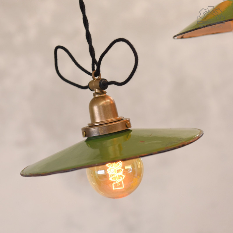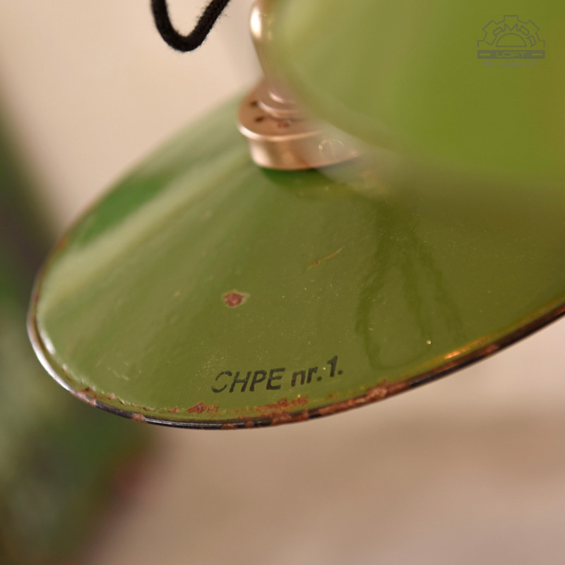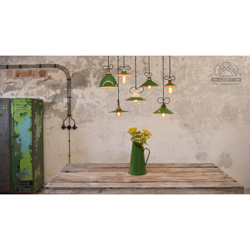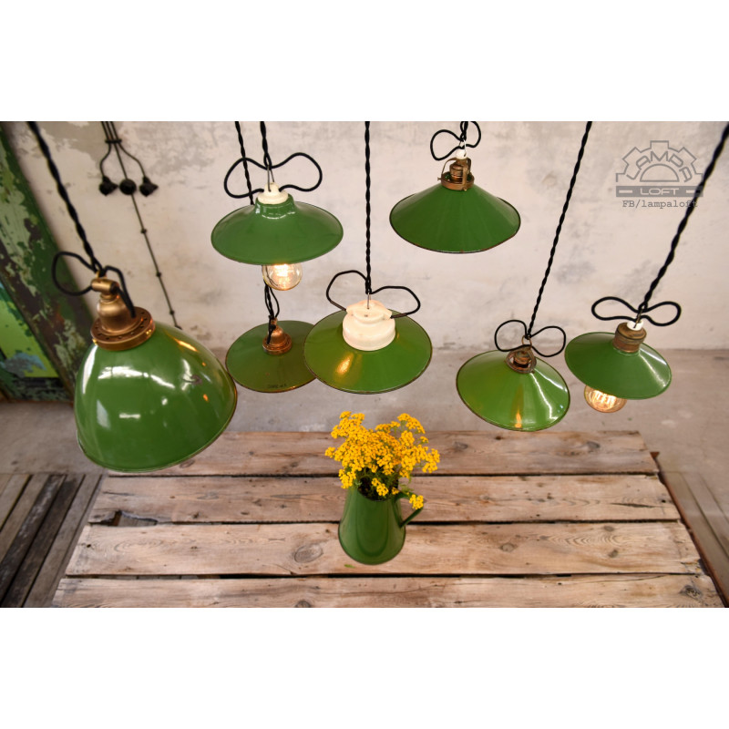 Zestaw lamp emaliowanych w pięknej zieleni. Lampy z lat 30'-60'. Lampy posiadają ładne cechy upływu czasu.