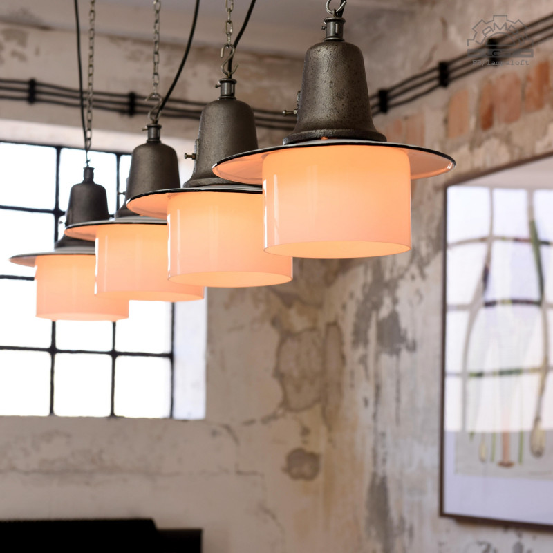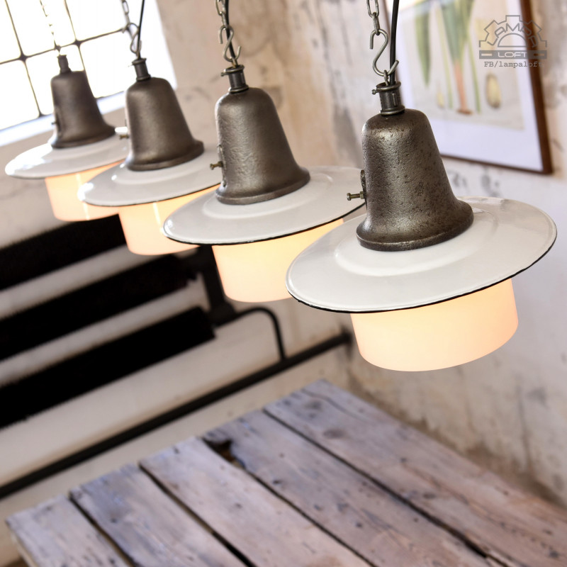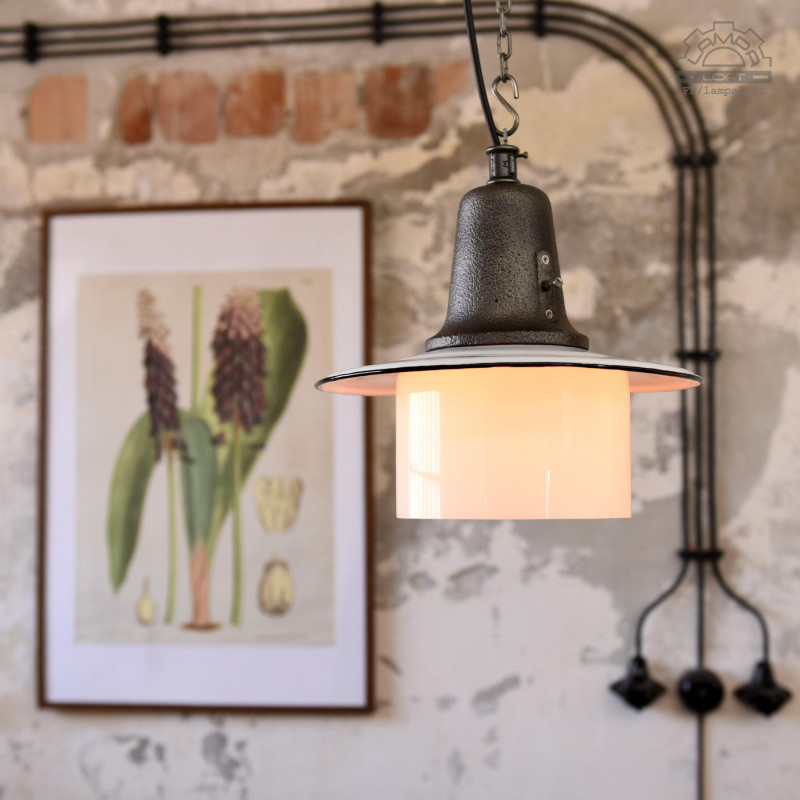 Żeliwny korpus, stalowy klosz, oprawka na zwykłą żarówkę E27 max. 100W.