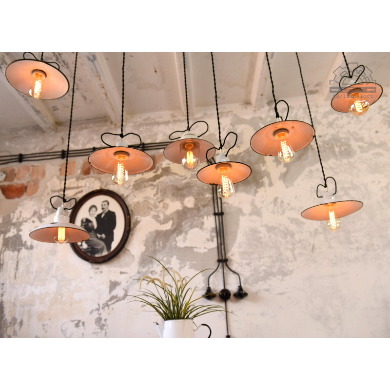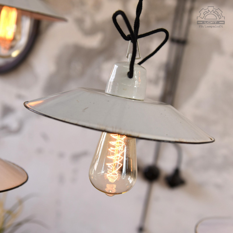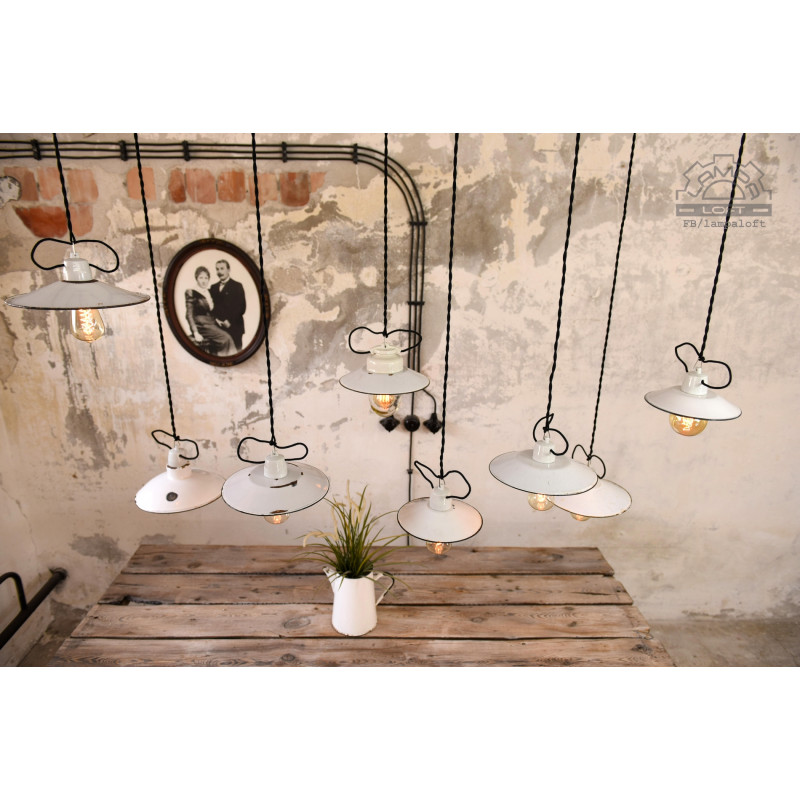 Zestaw białych lamp emaliowanych. Lampy z lat 30'-60'. Lampy posiadają ładne cechy upływu czasu.