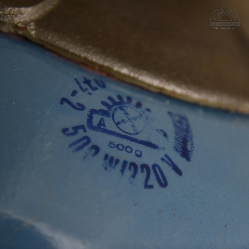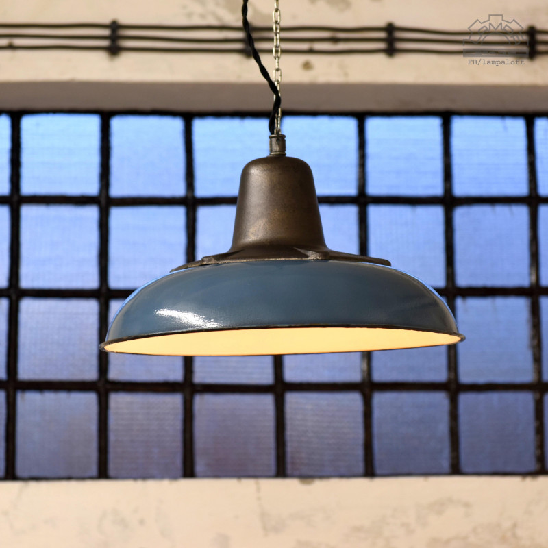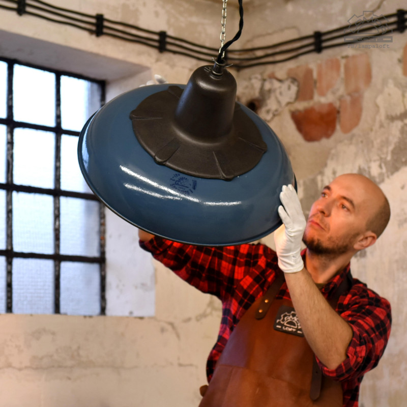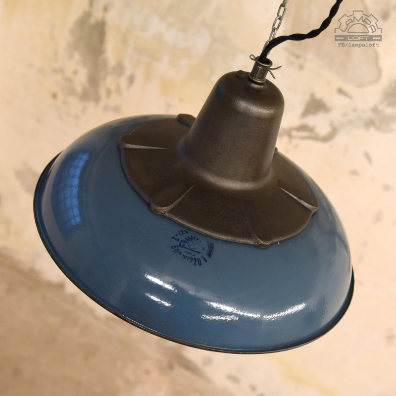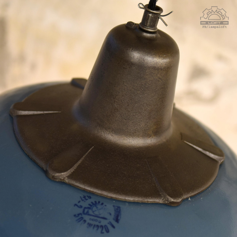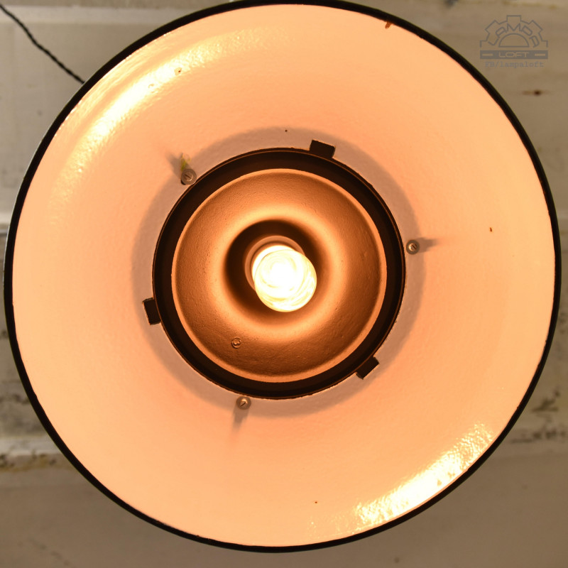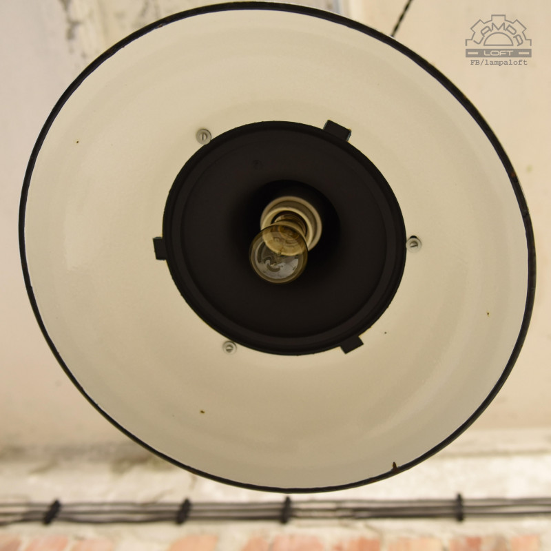 Emaliowana lampa industrialna wyprodukowana w latach 60' przez Mazurskie Zakłady Aparatury Oświetleniowej A-23 w Wilkasach.