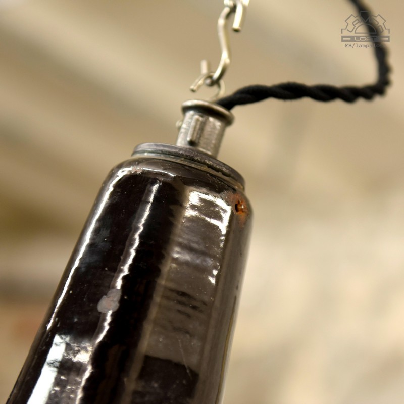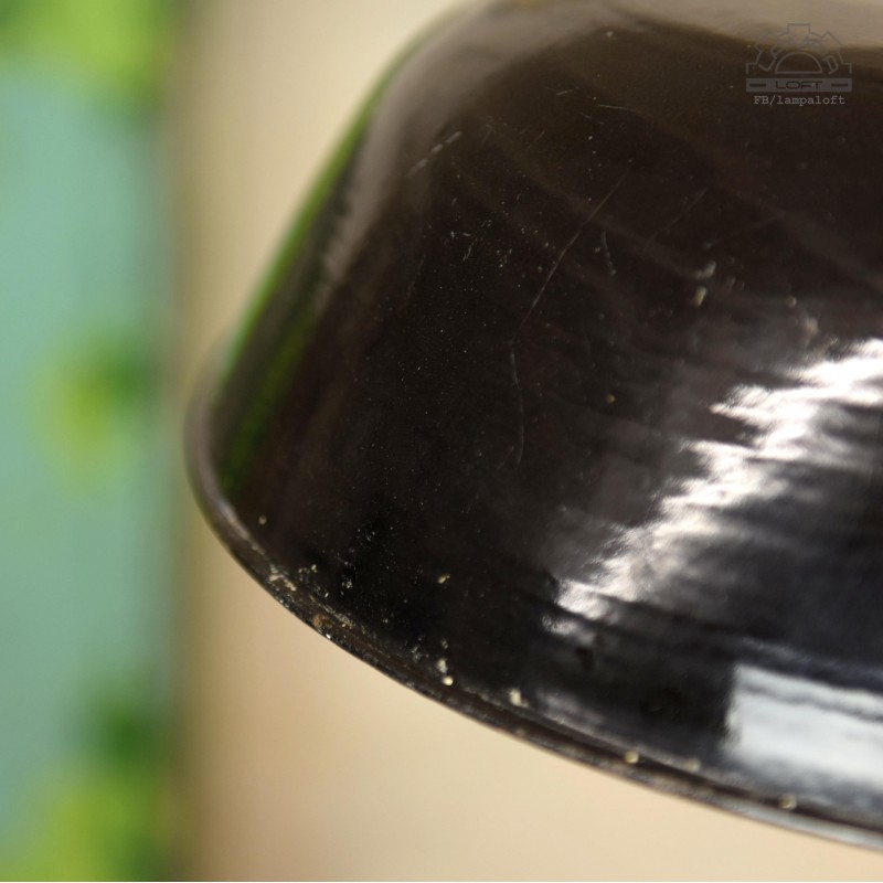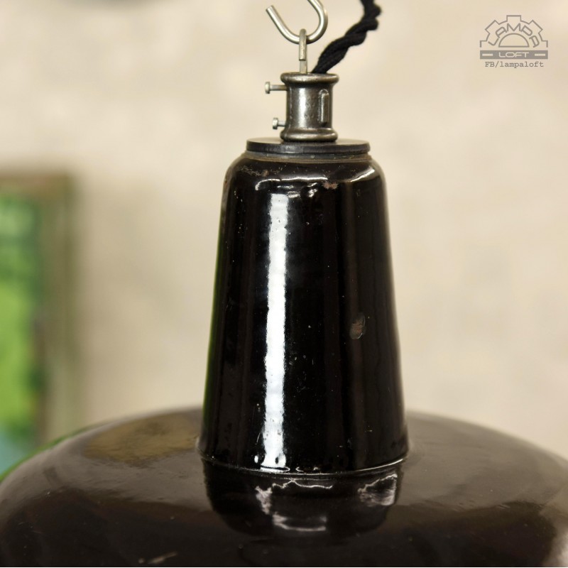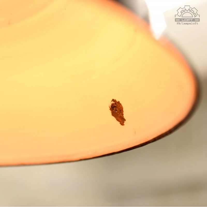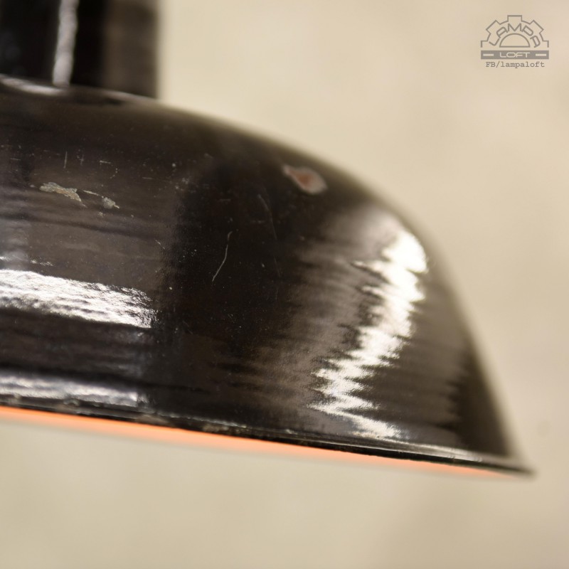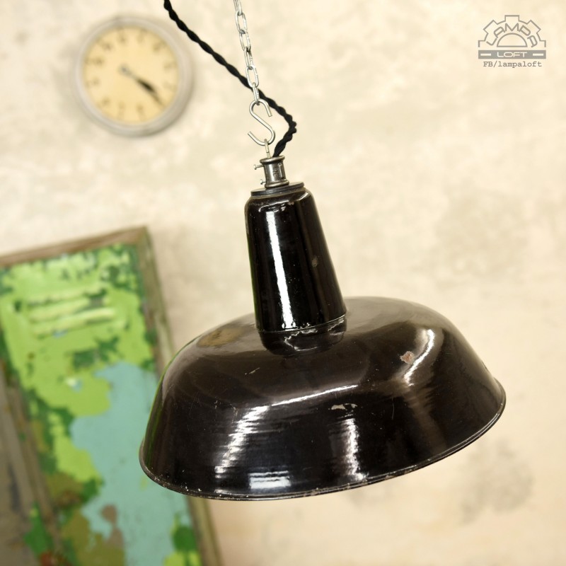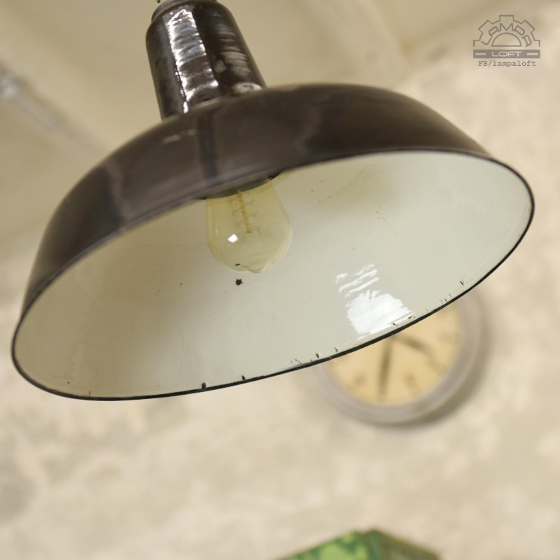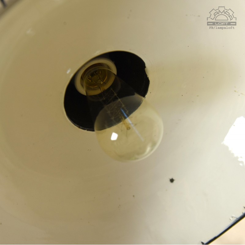 Emaliowana lampa industrialna z lat 30' Lampa o średnicy 39cm, przewód w oplocie bawełnianym o długości 150cm. Oprawka porcelanowa na zwykłą żarówkę E27 max. 100W. Lampa posiada cechy upływu czasu. Drobne otarcia, kilka odprysków.