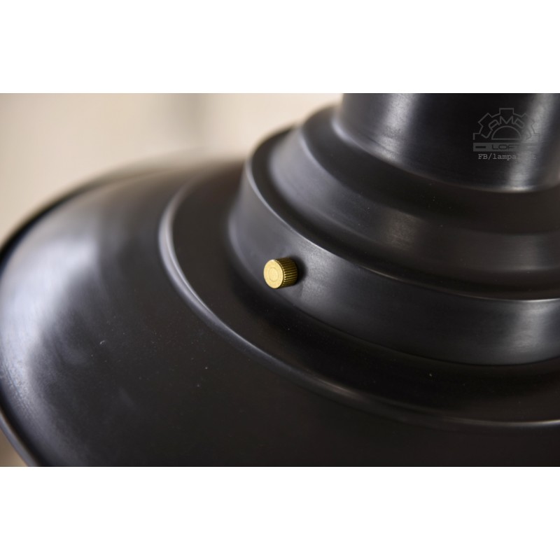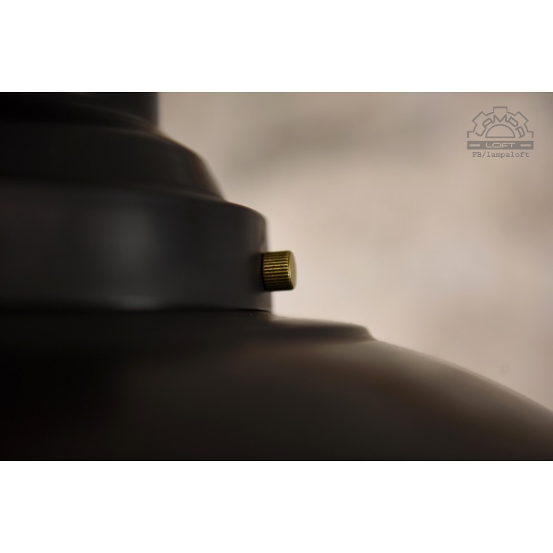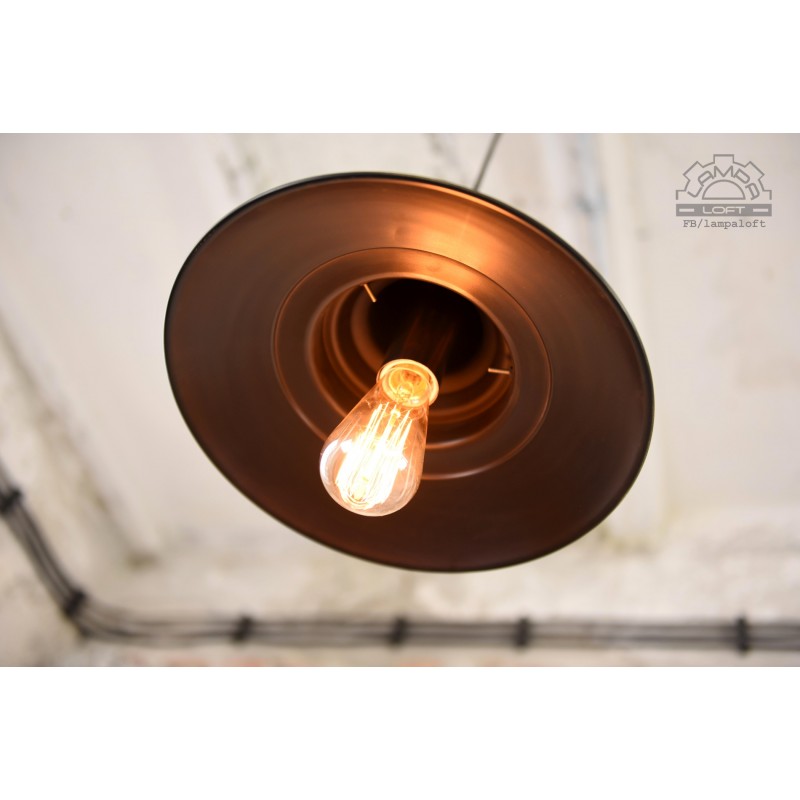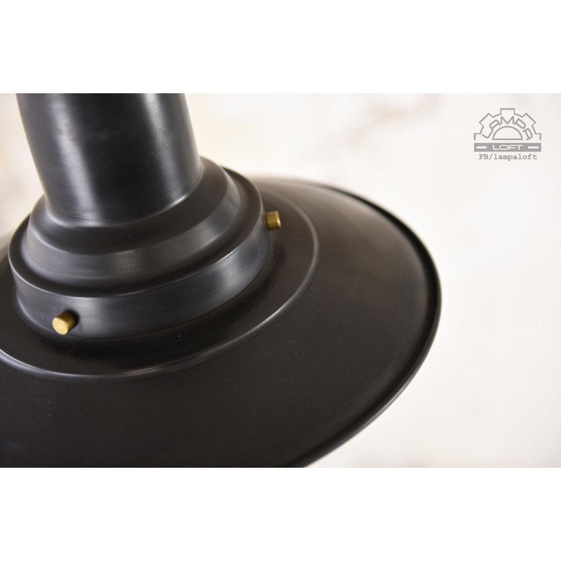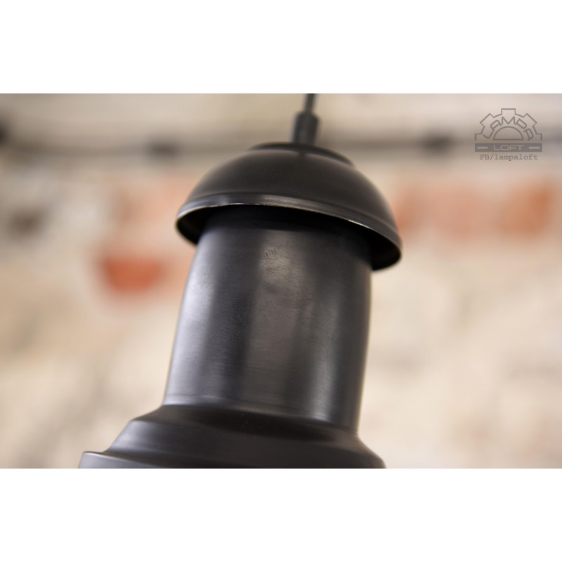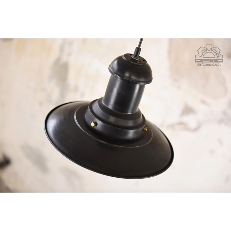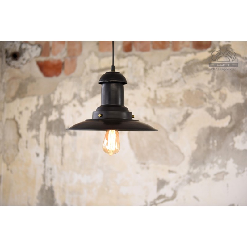 Lampa industrialna odrestaurowana w czarnej patynie. Średnica 32cm, wysokość 28cm. Długość całej lampy z przewodem 160cm. Oprawka porcelanowa na zwykłą żarówkę E27 max. 60W