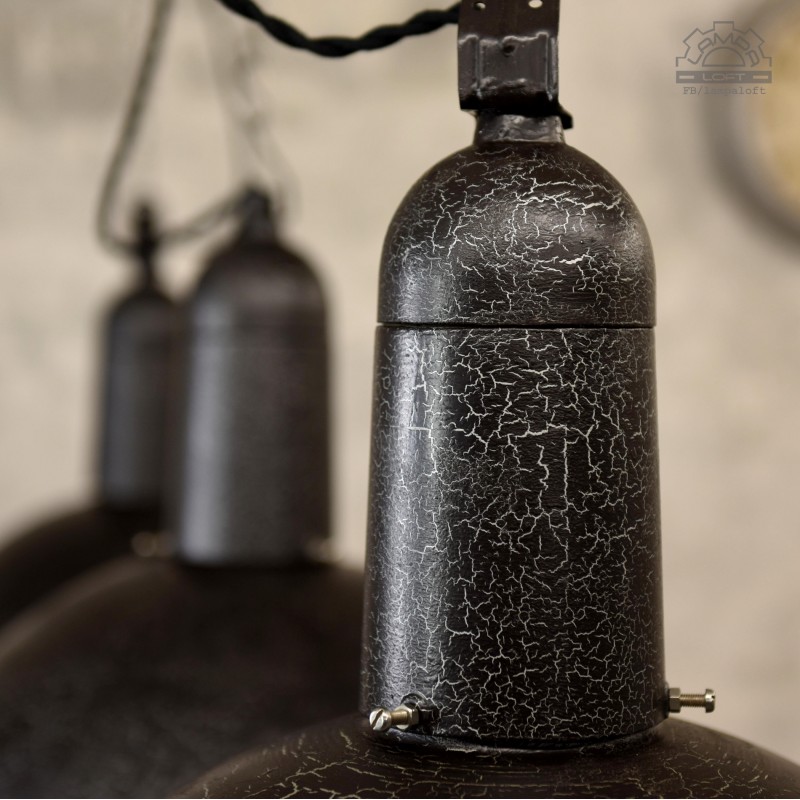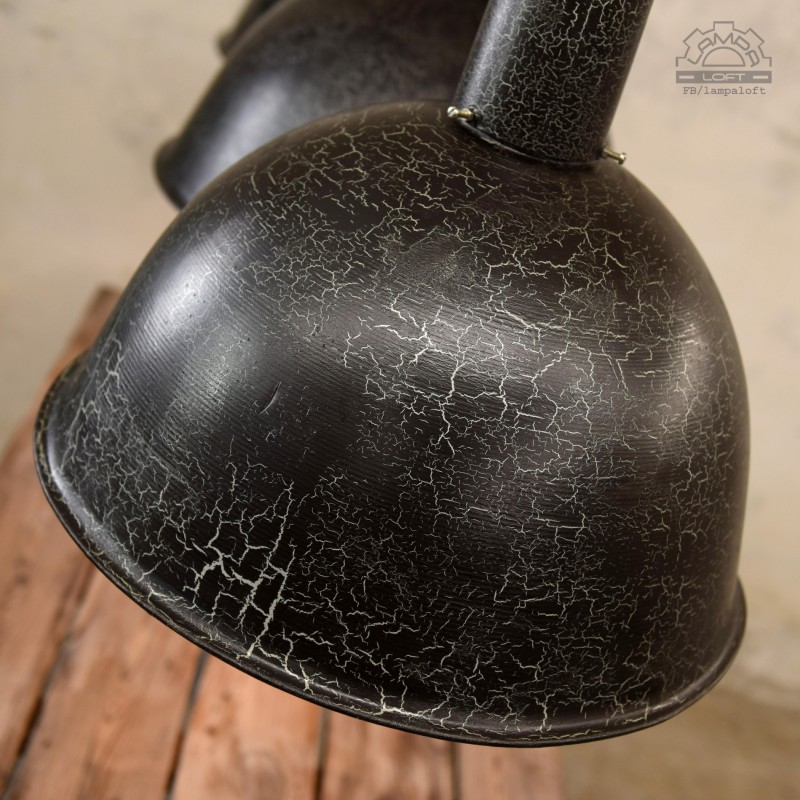 Unikalne lampy norweskiej firmy Glamox, założonej w 1947 roku przez norweskiego inżyniera i wynalazcę Birgera Hatlebakka. Odkrył metodę elektrochemicznej obróbki powierzchni aluminium, którą nazwał glamox. Stąd też nazwa jego firmy. Lampy odrestaurowane w czarnej patynie ze spękaniami. Wnętrze białe w patynie ze spękaniami. Model IGA 1000 z lat 70'. Oprawka porcelanowa na żarówkę E27 max. 200W. Przewód czarny skręcany w oplocie bawełnianym.