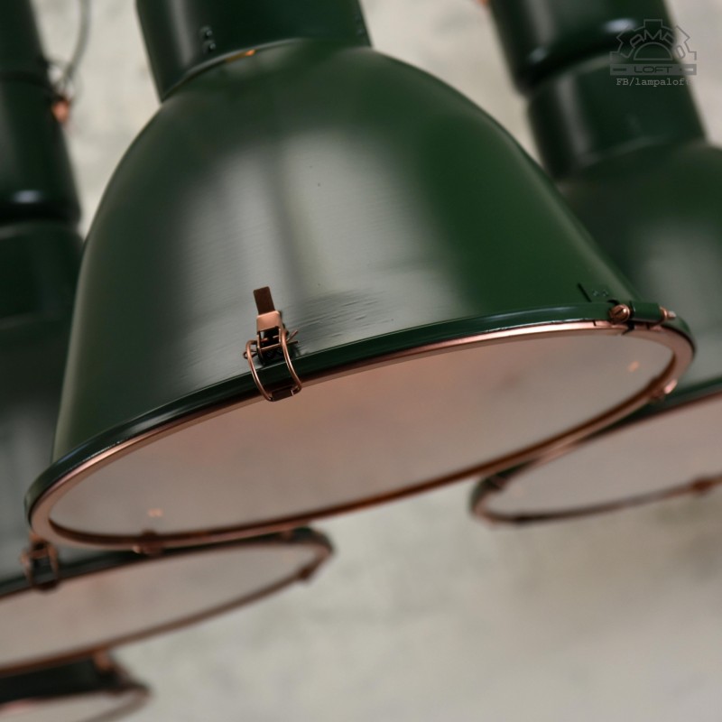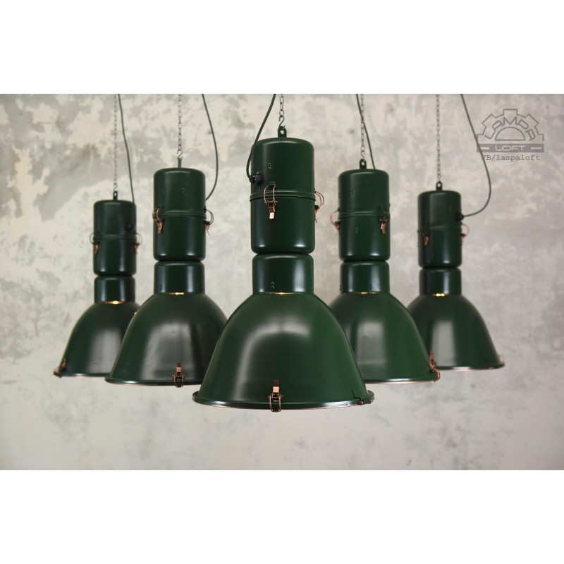 Odrestaurowane lampy industrialne wyprodukowane przez Elgo Gostynin. Model OPS-250. Głęboka zieleń i miedź. Średnica 46cm, wysokość 70cm, długość całej wiszącej lampy z przewodem w oplocie 260cm. Waga 7kg. Oprawka ceramiczna na zwykłą żarówkę E27 max. 100W. Przygotowana do zawieszenia. Kostka do podłączenia w czarnej osłonie sufitowej.