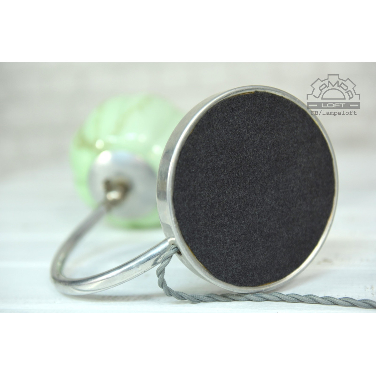 Podstawa średnicy 14cm, klosz szklany średnicy 14cm, wysokość lampy 25cm, przewód w oplocie 125cm.